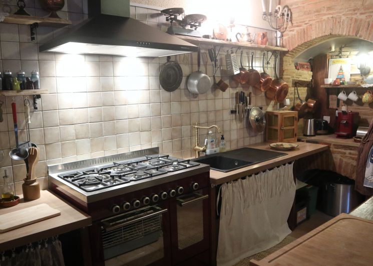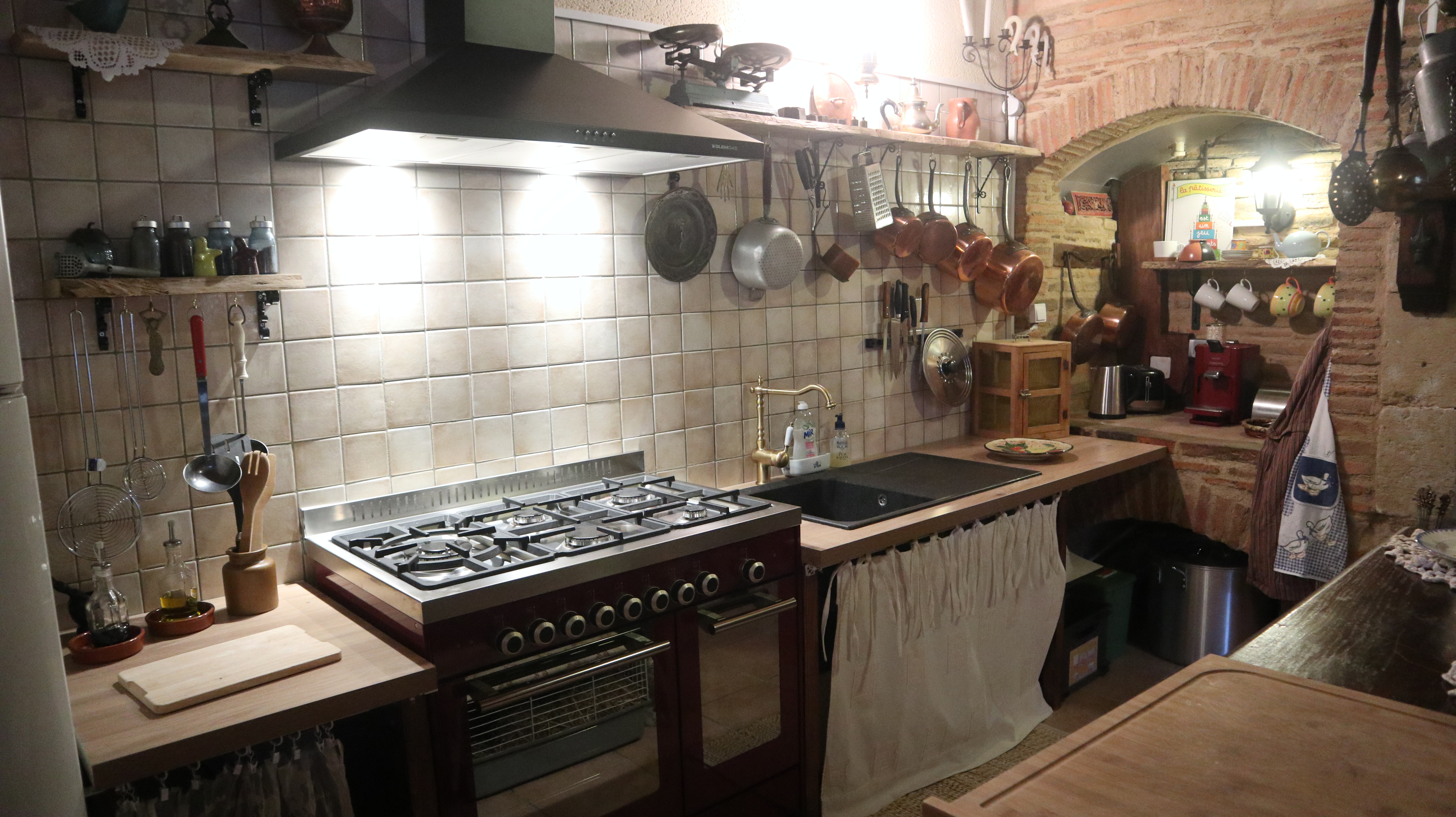 -une cuisine salle à manger, organisée autour de la grande cheminée et entièrement équipée avec un piano de cuisson, un réfrigérateur avec compartiment congélateur. Table en chêne massif.