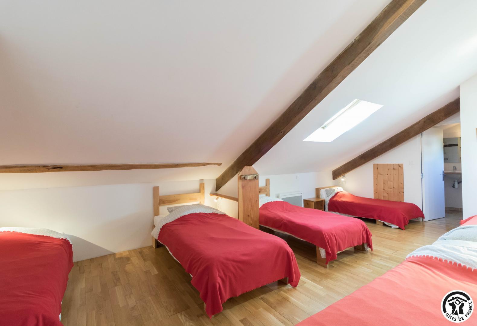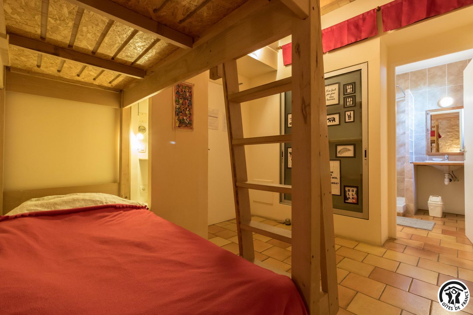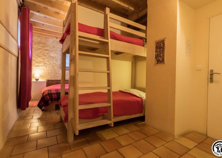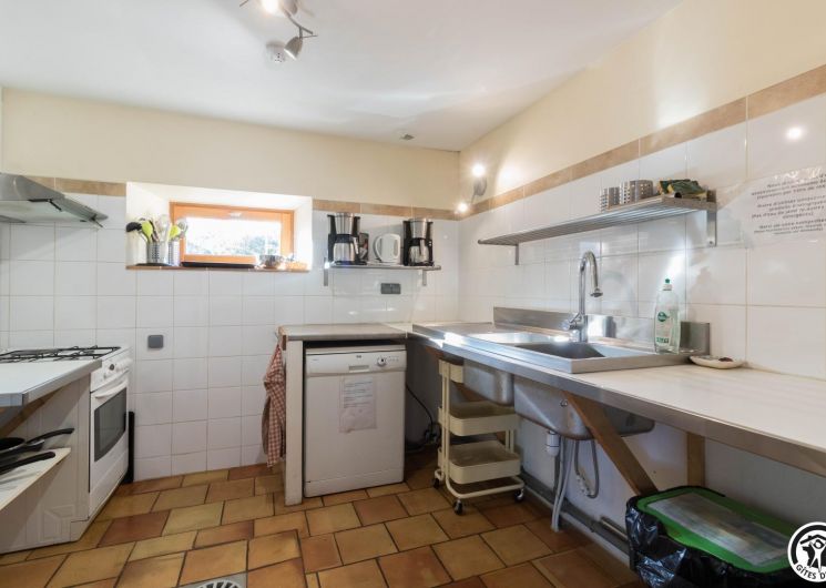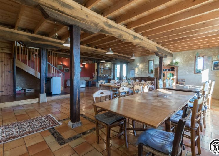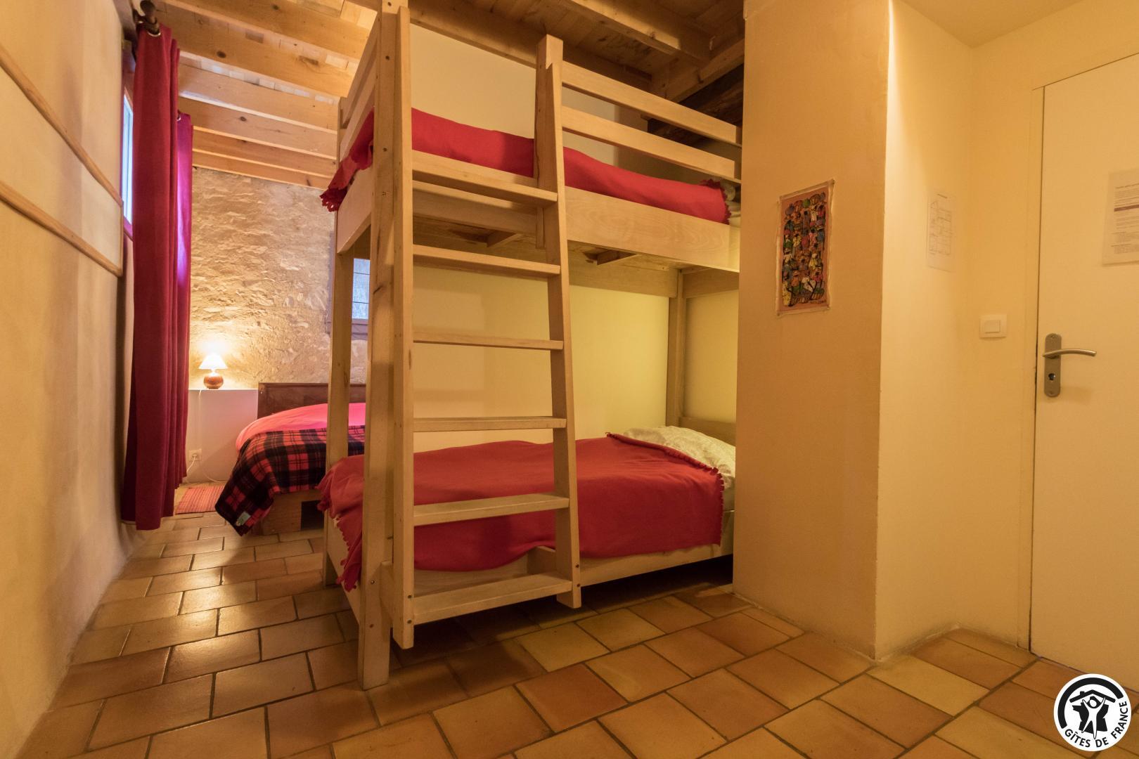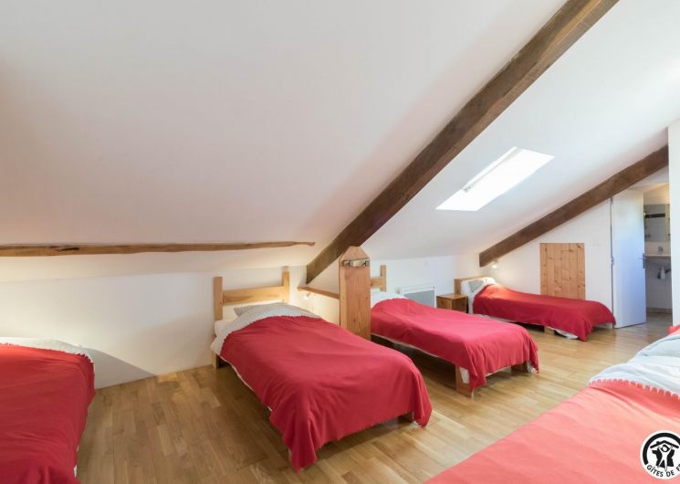 – Planta baja: salón – 2 cocinas – habitación PMR (2 camas gemelas de 80*20cm) – habitación de 4 camas (1 cama de 160*200cm + 2 literas de 90*190cm).
