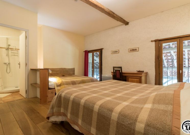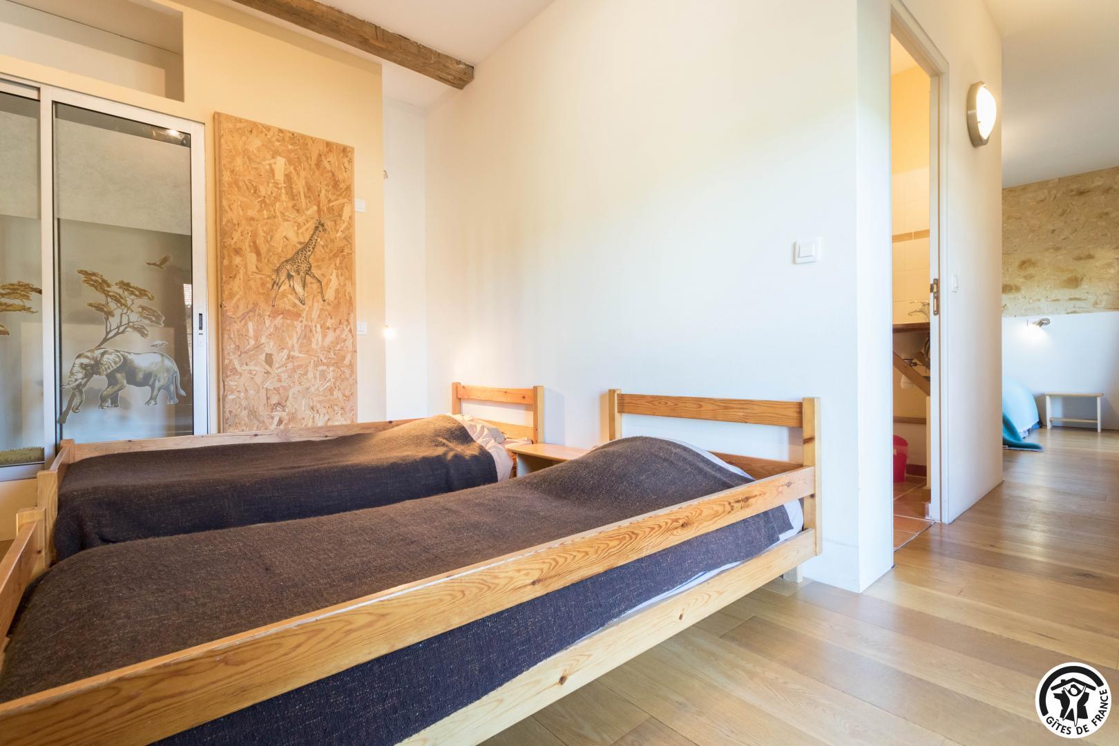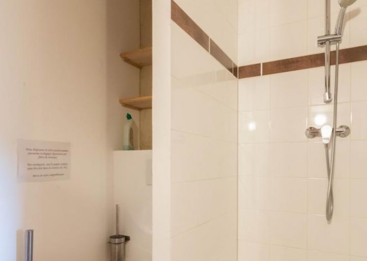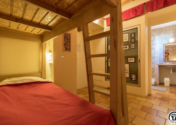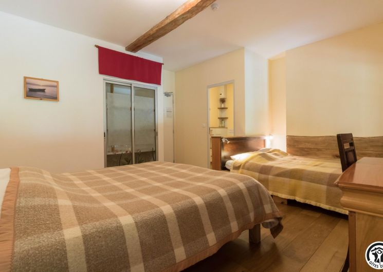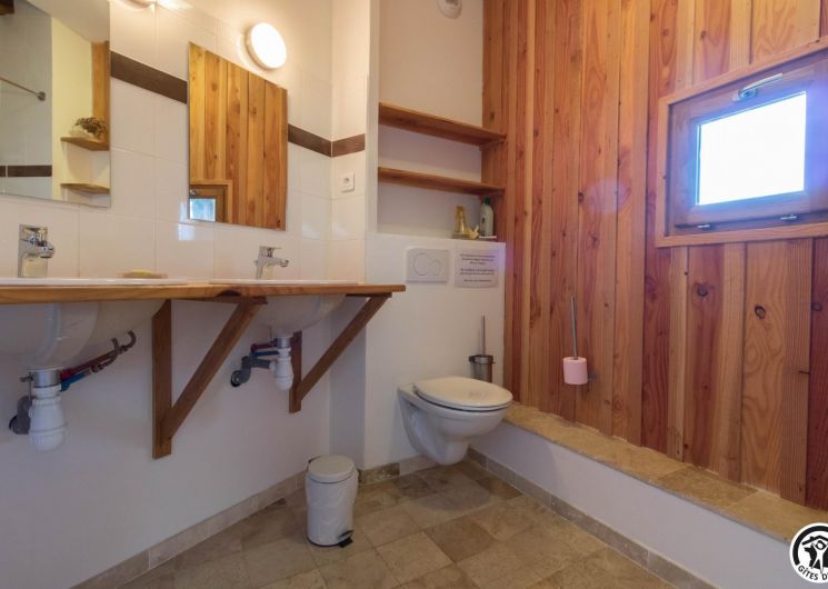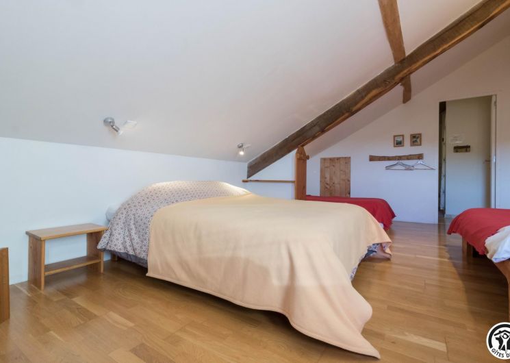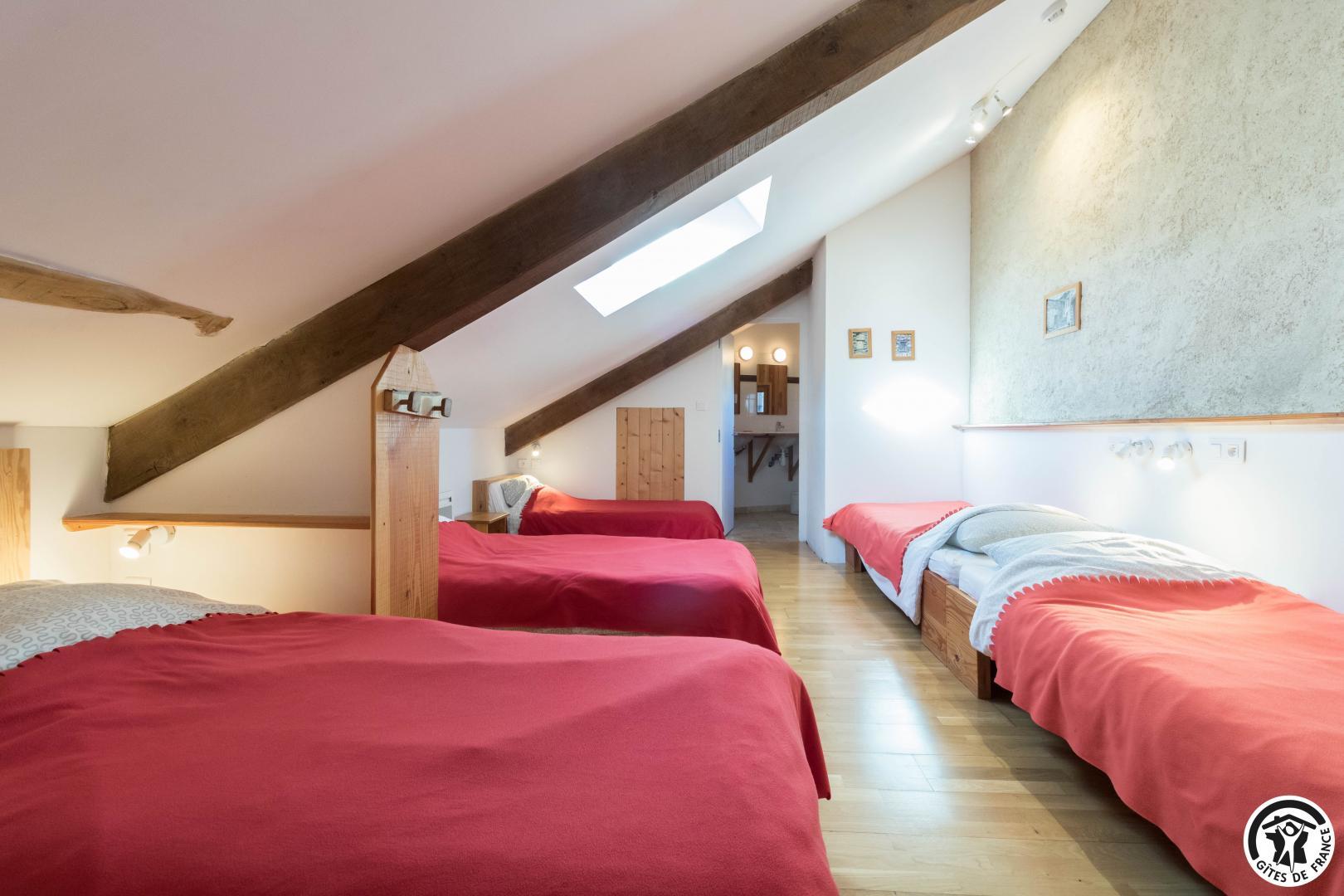 – Planta baja: salón – 2 cocinas – habitación PMR (2 camas gemelas de 80*20cm) – habitación de 4 camas (1 cama de 160*200cm + 2 literas de 90*190cm).