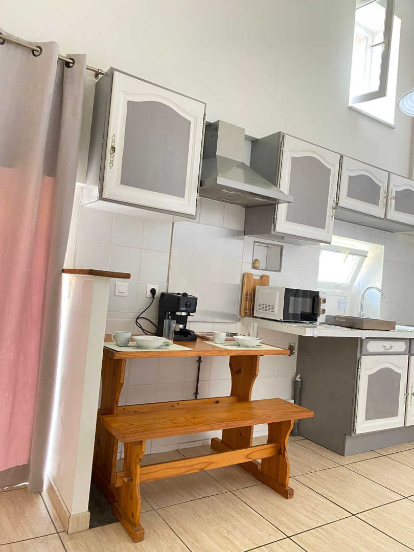 Séjour avec salon, TV et table à manger, en suivant la cuisine équipée. Après la cuisine, une petite salle permet d’accéder à une grande salle festive (comprise avec la location du gîte).