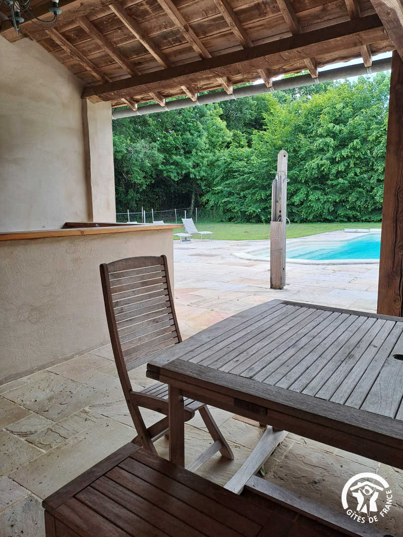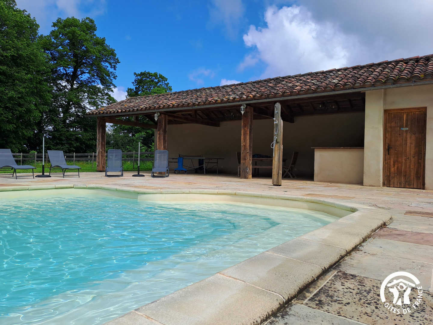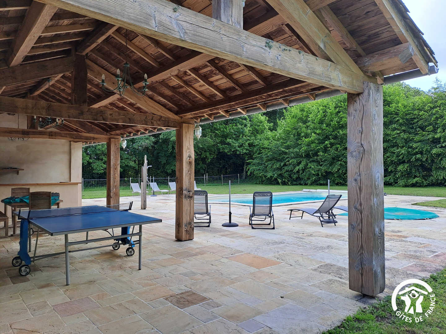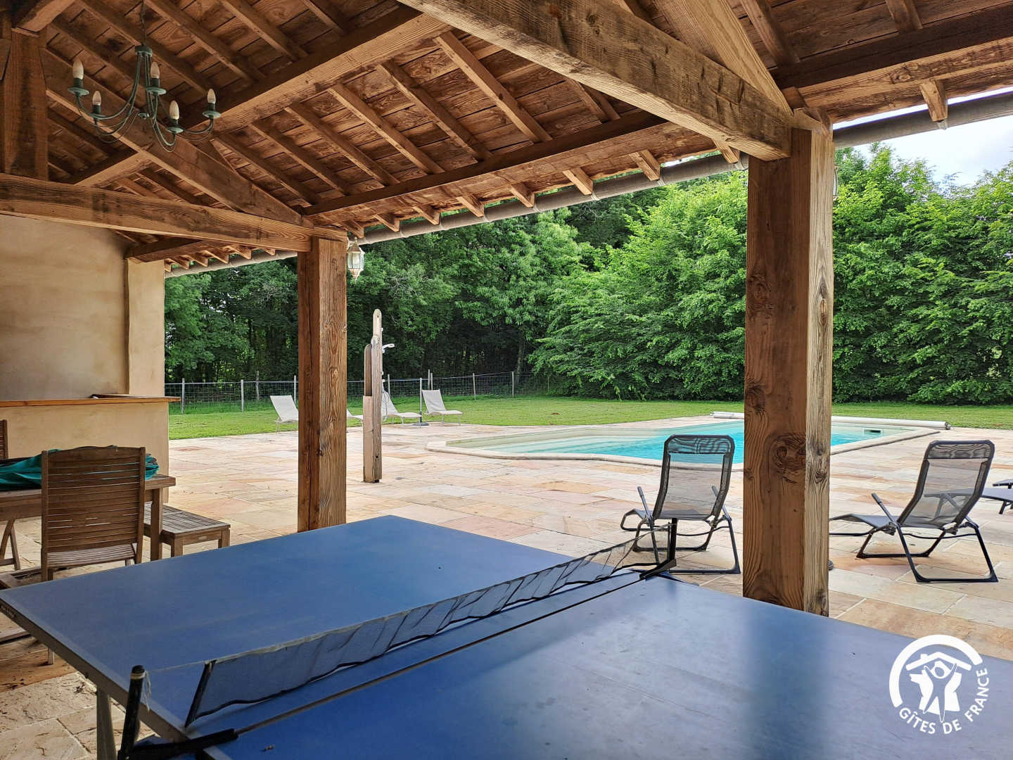 L’extérieur : plusieurs terrasses, un abri couvert, un barbecue et le portique pour les enfants, piscine ouverte de juin à septembre, 10x5m avec fond progressif. Un bâtiment abrite la table de ping-pong et table à manger d’appoint.