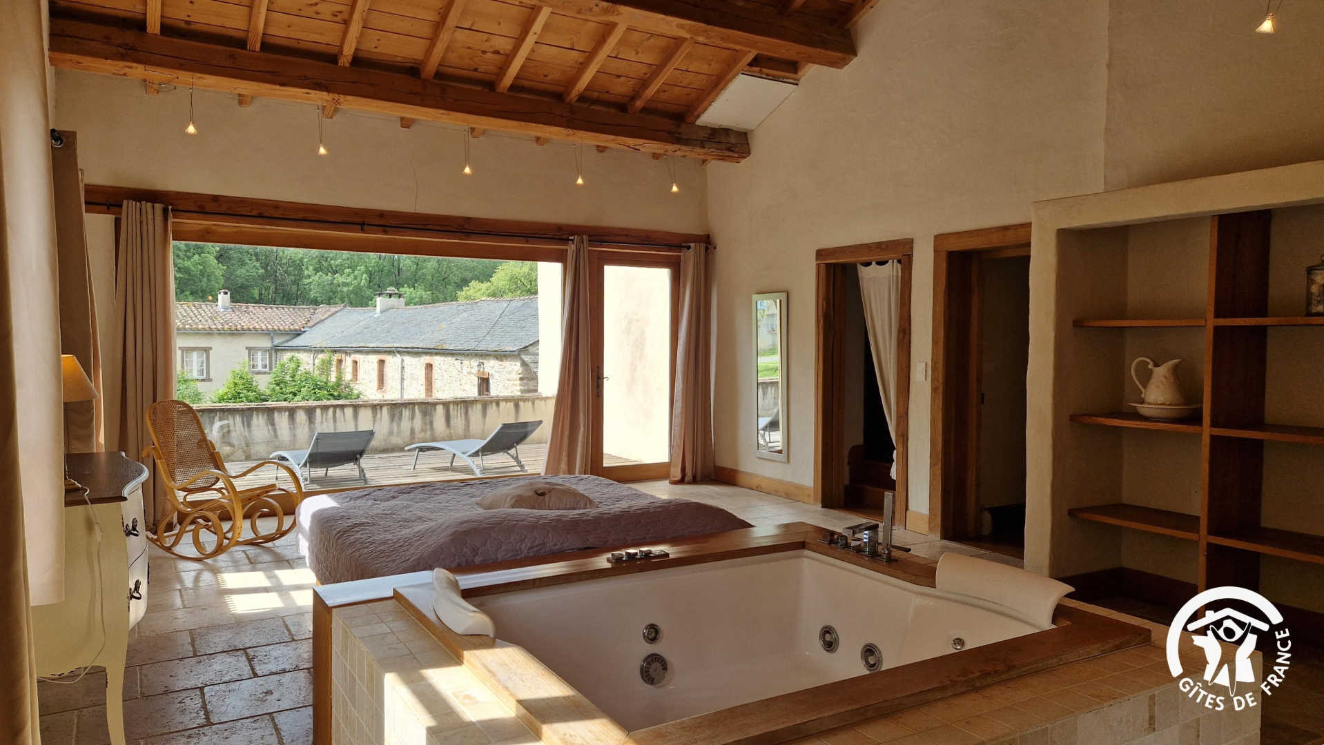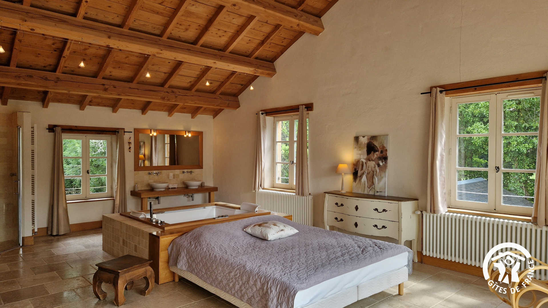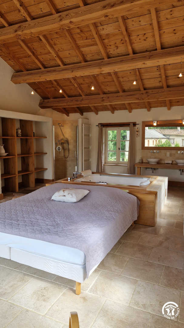 – la dernière chambre, une immense suite parentale avec lit en 180cm, baignoire balnéo deux places, grande douche, double vasque, dressing et balcon privatif.