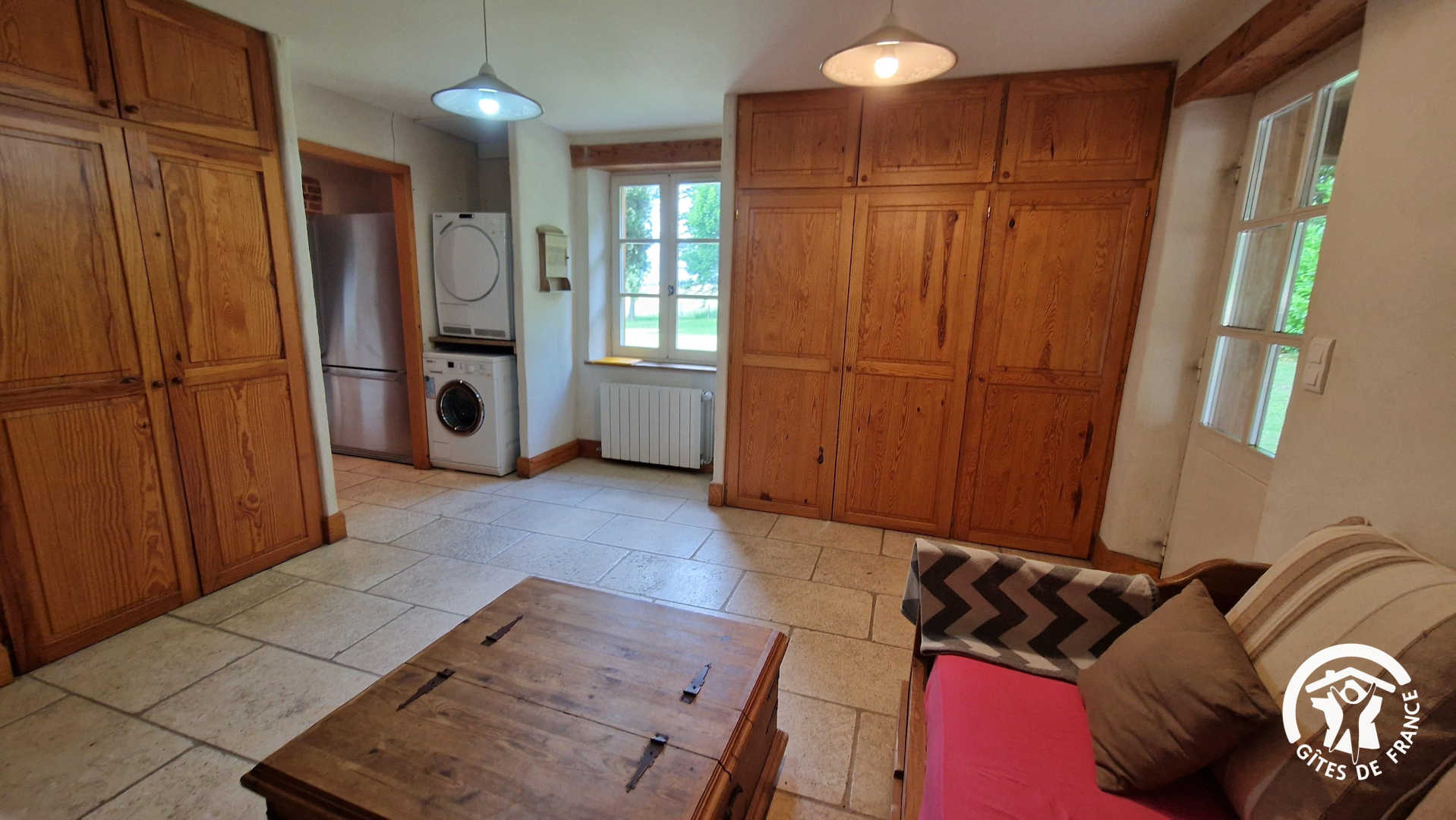 – grand séjour avec salon (cheminée et TV) et table à manger. Une cuisine toute équipée : lave-vaisselle, piano de cuisson avec four, cafetière à dosettes Senseo®, micro-ondes, réfrigérateur américain, lave-linge et sèche-linge.