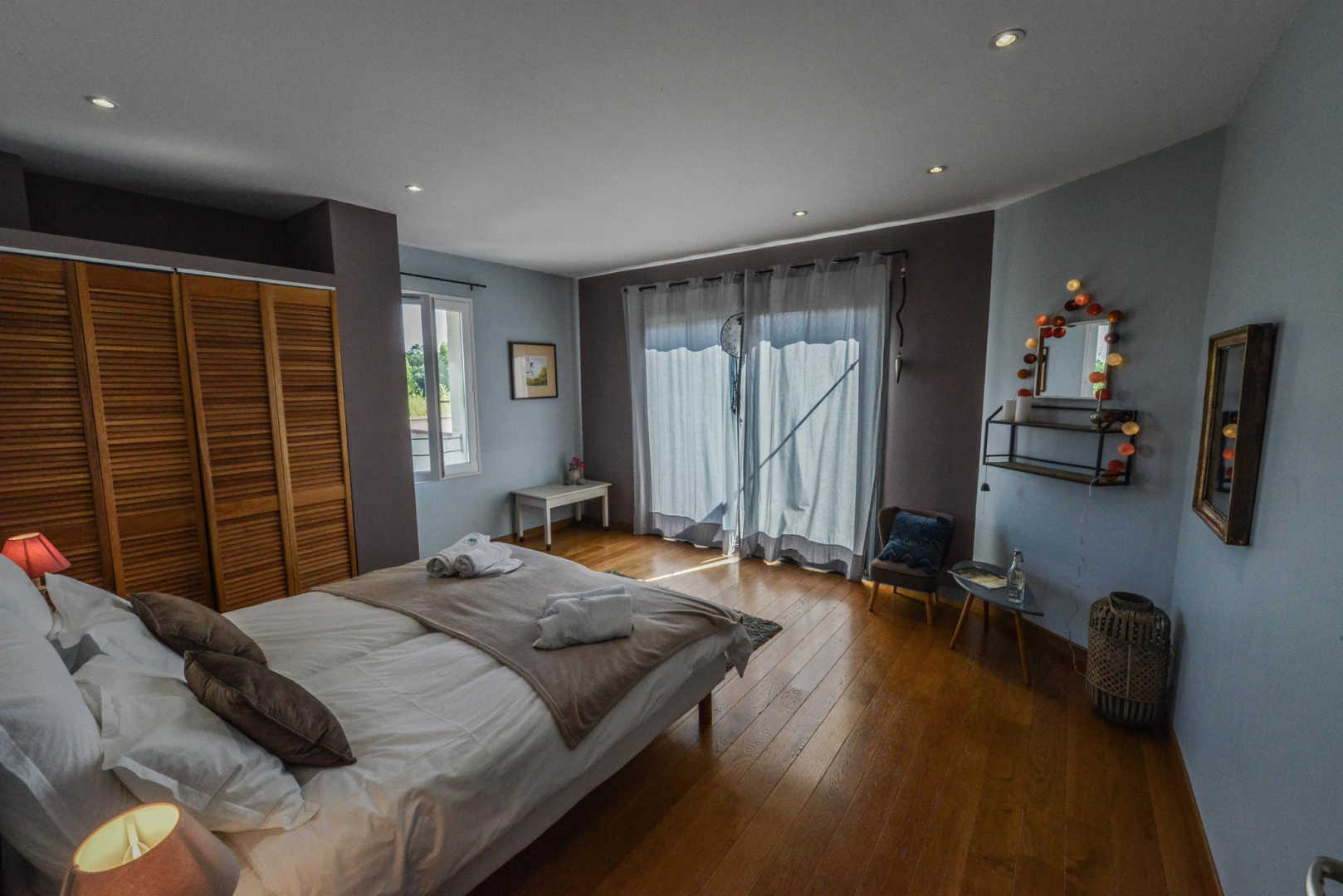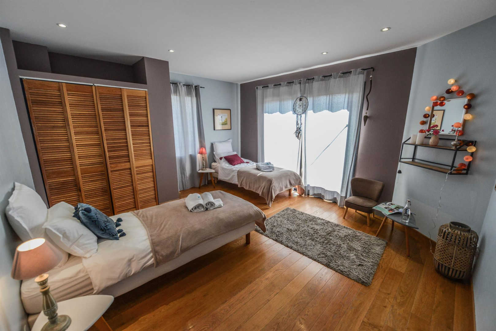 Cinq chambres, deux en rez-de-chaussée, et trois à l’étage, quatre salles d’eau.
