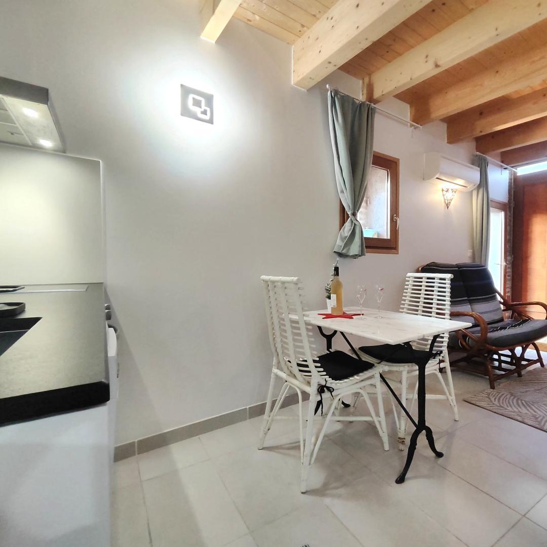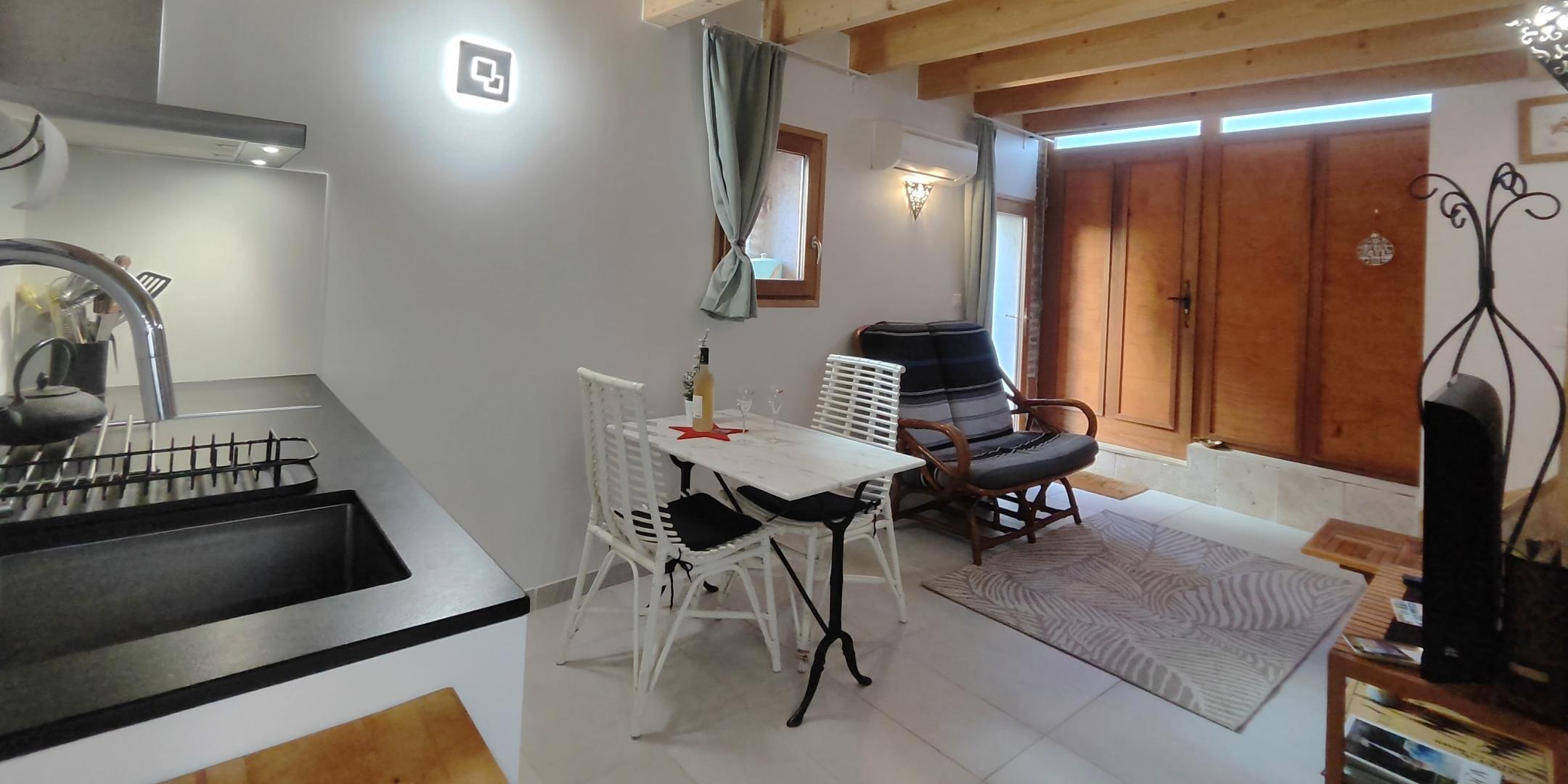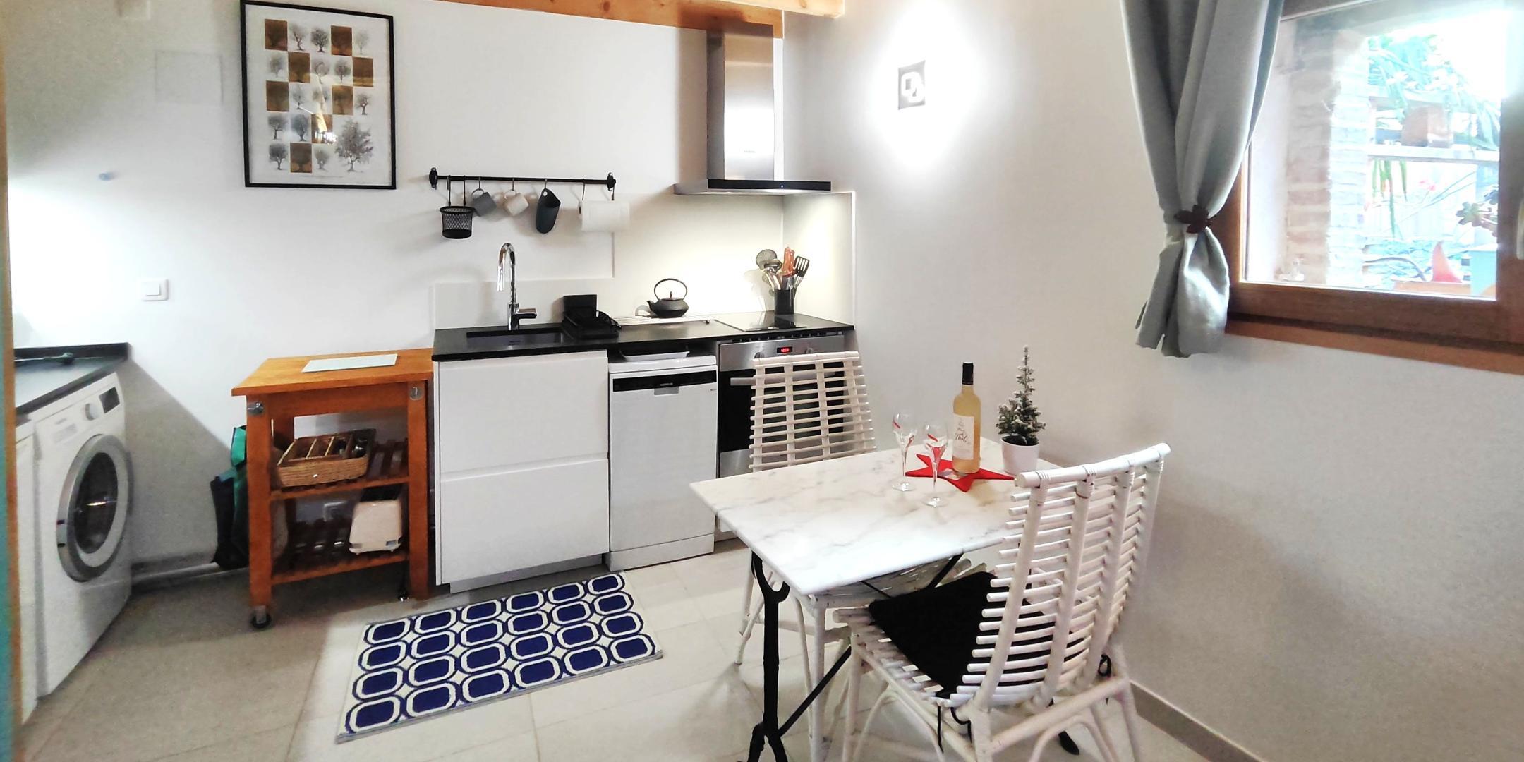 La Grange aux hirondelles tiene su propia entrada en una calle pequeña y tranquila y consta de una sala principal en la planta baja (aprox. 16 m²) con cocina totalmente equipada, comedor, salón y aseo. Arriba, en un altillo, hay un dormitorio con cama doble y cuarto de baño con ducha y lavabo. La habitación de la planta baja da a una terraza privada de unos 12 m² con muebles de jardín y tumbonas.