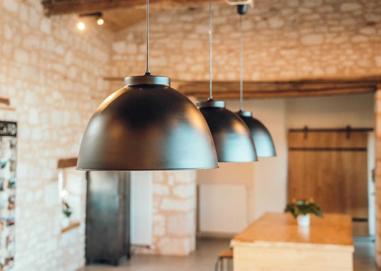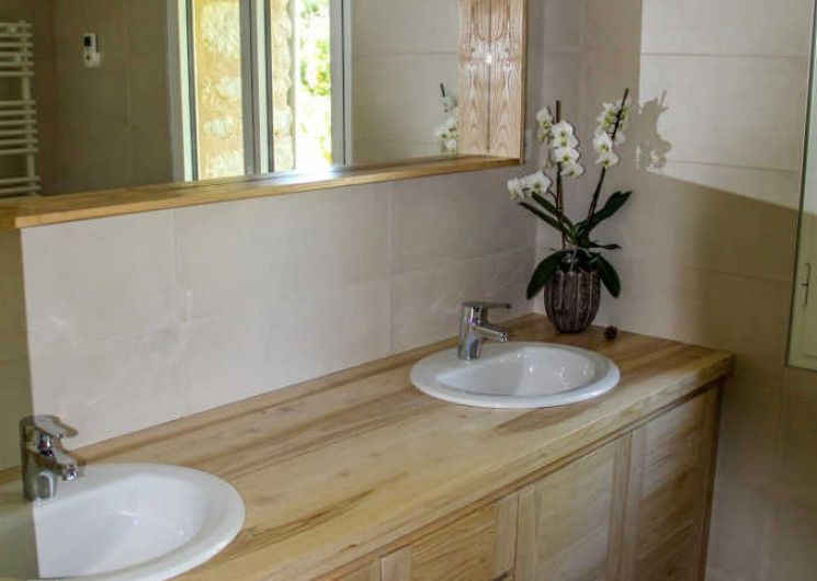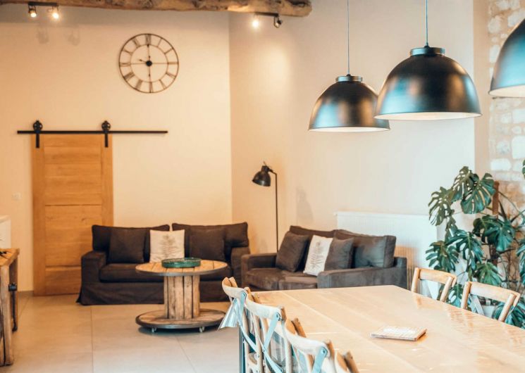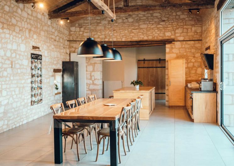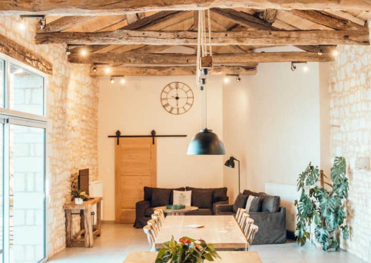 De plain pied : immense séjour avec une jolie charpente, trois chambres dont une avec salle d’eau privative et une spéciale enfants.