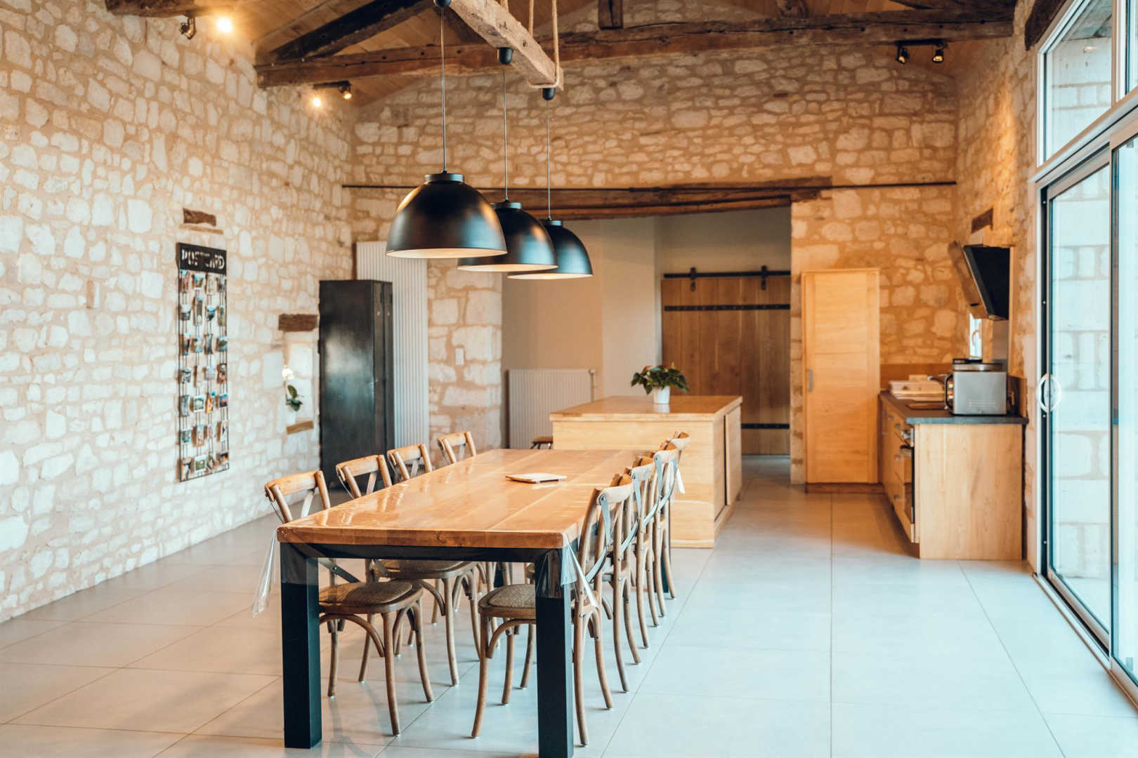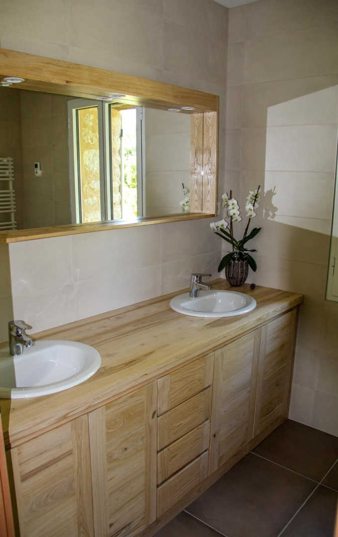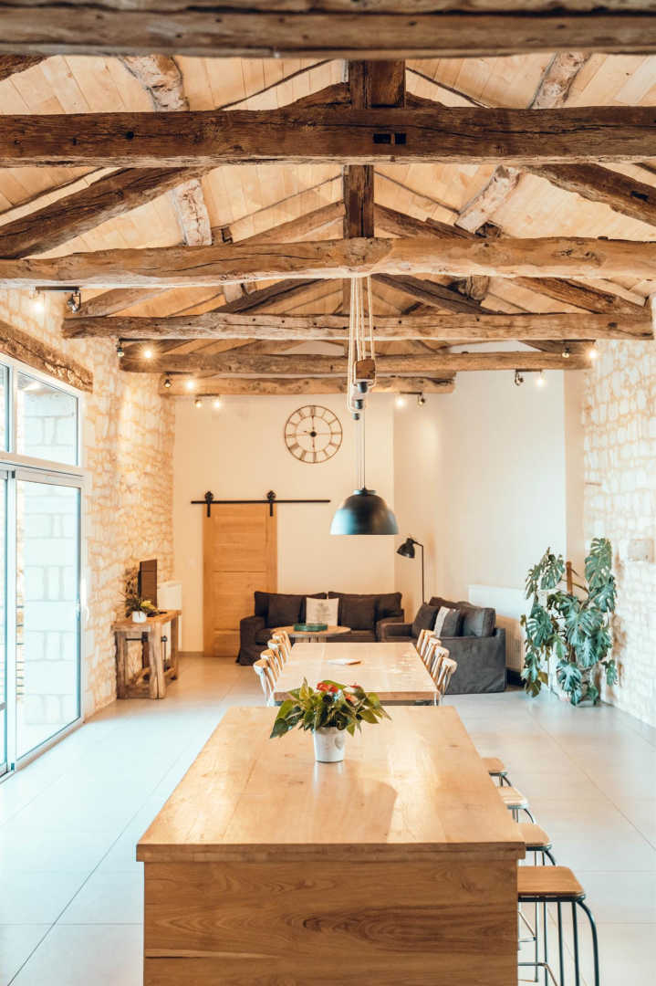De plain pied : immense séjour avec une jolie charpente, trois chambres dont une avec salle d’eau privative et une spéciale enfants.