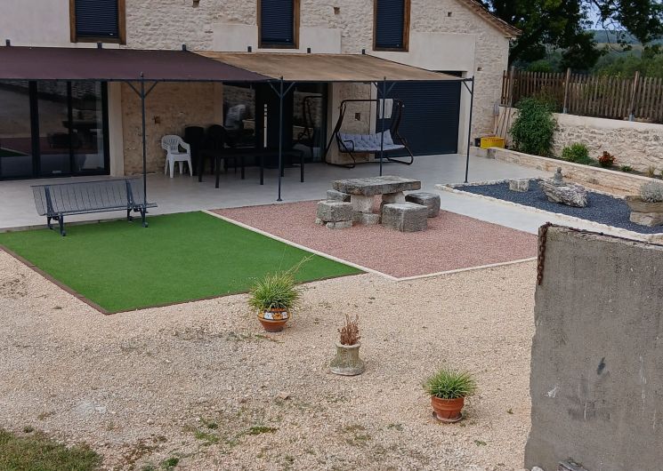 Large, partly covered terrace with garden furniture, 3 sun loungers and barbecue. Above-ground swimming pool (8×4) with beach. Boules pitch, parking in front of the house.