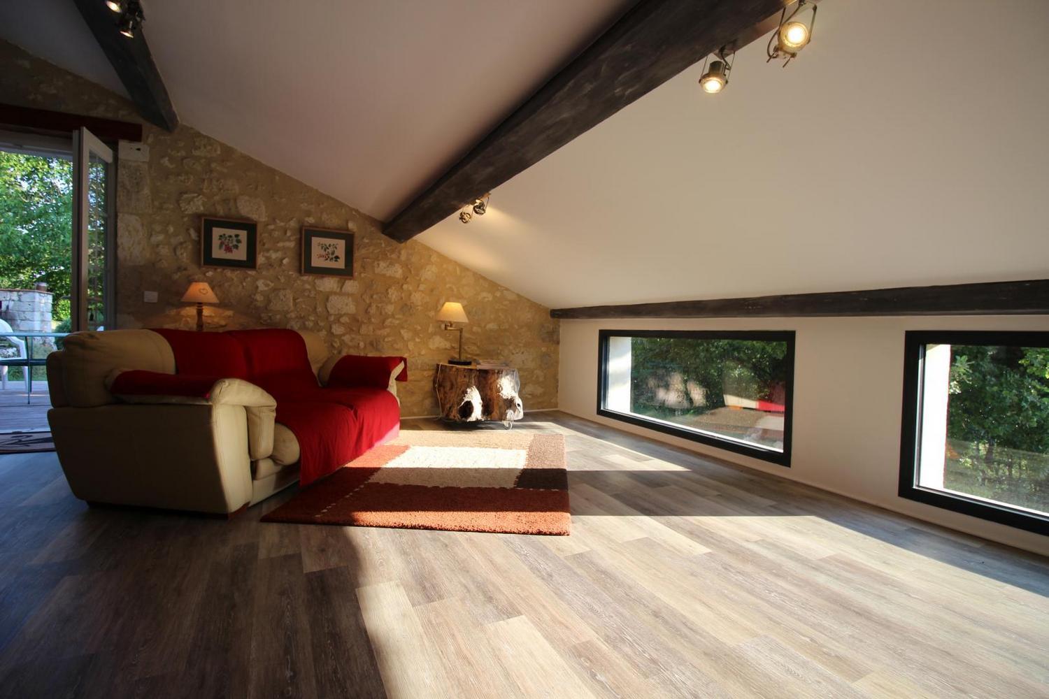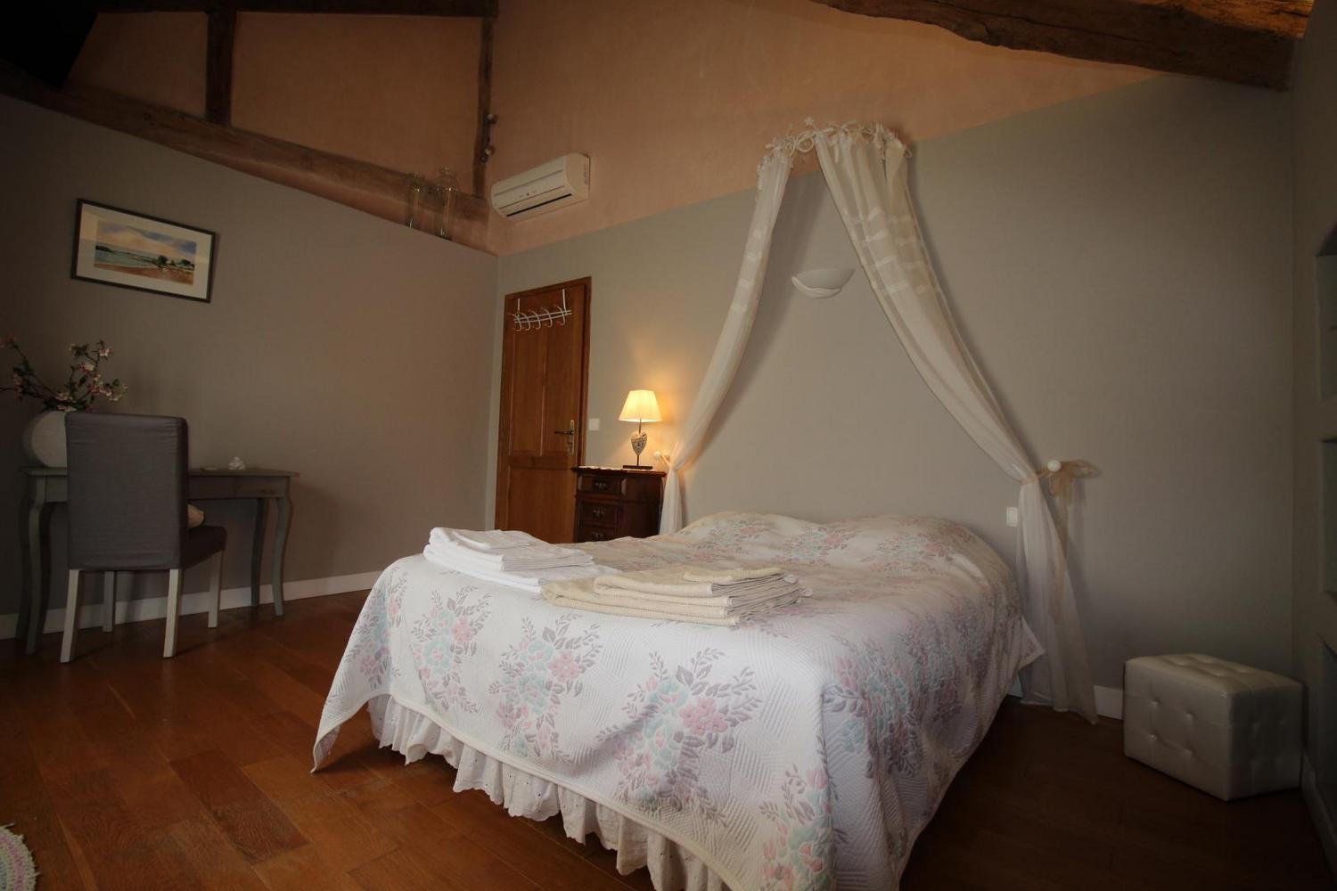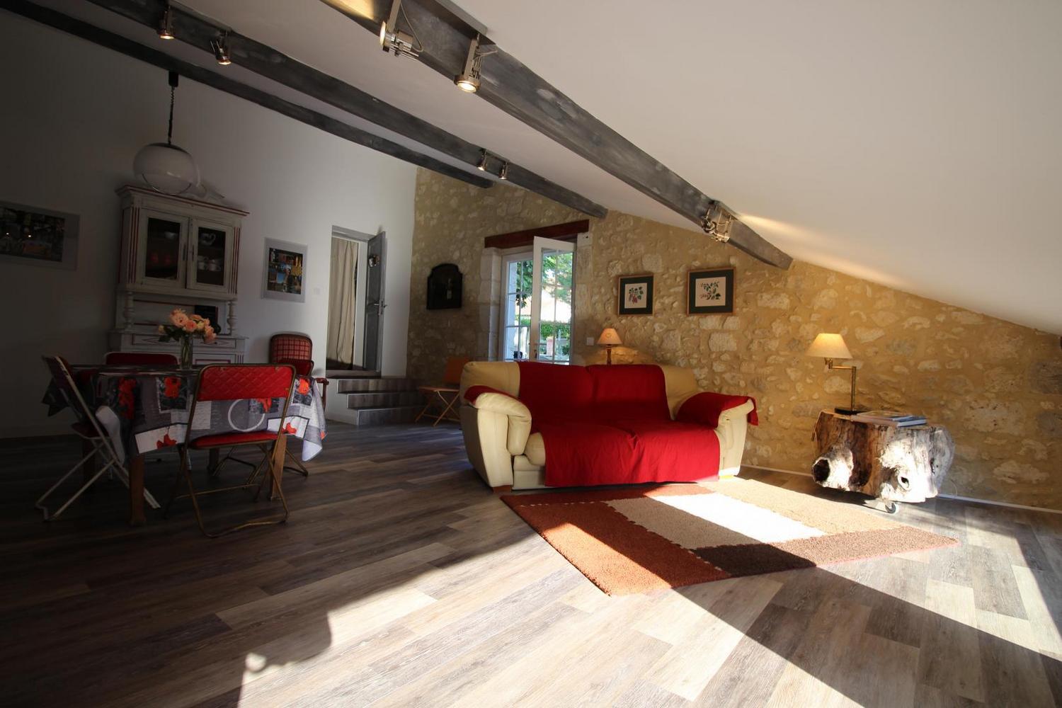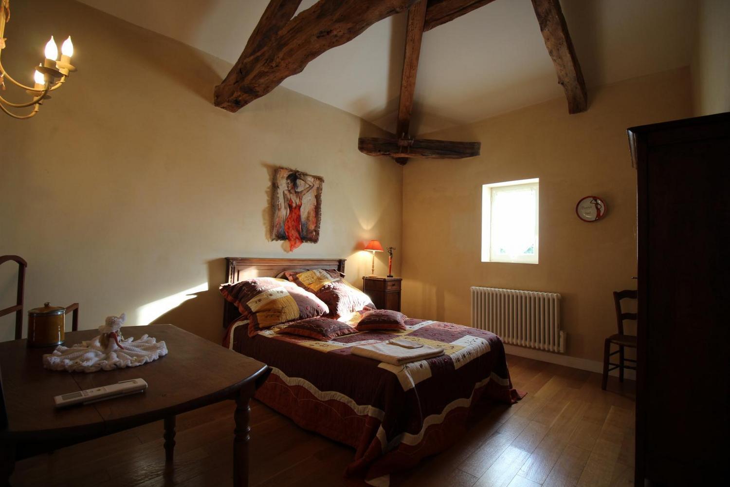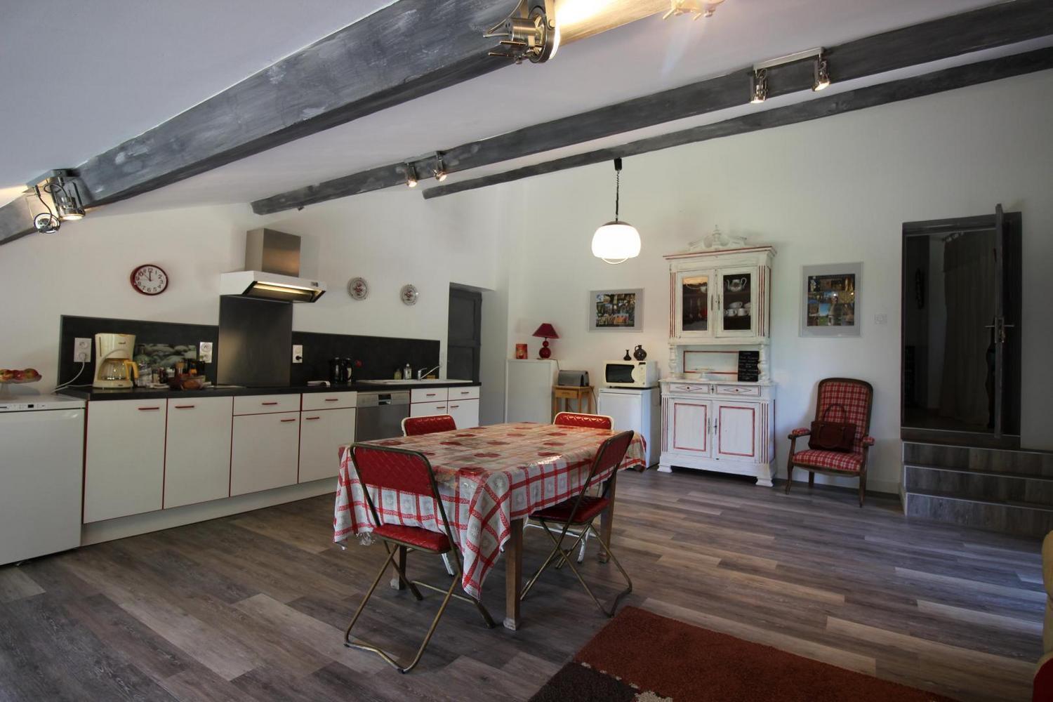 Mitoyen à l’habitation des propriétaires, gîte de 100m² aménagé en rez-de-chaussée et étage (accès par un couloir commun aux propriétaires). Séjour ouvrant sur la terrasse privative, buanderie, à l’étage: chambre 1 avec 1 lit 140 (télévision), chambre 2 avec 1 lit 140, salle d’eau avec wc. Climatisation réversible dans les chambres.