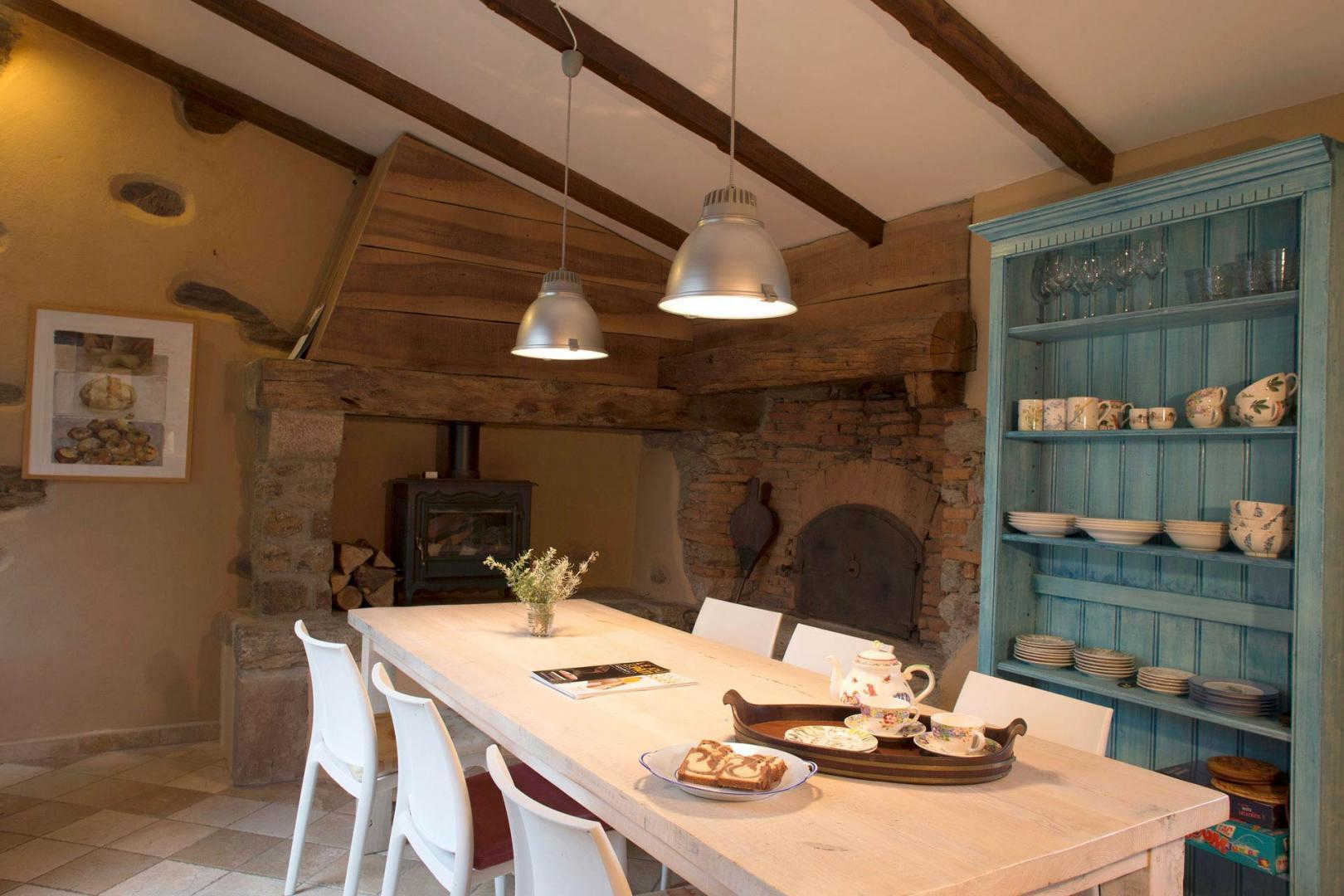 Grand et agréable salon avec poêle à bois ainsi qu’une bibliothèque de livres de cuisine qui sont à votre disposition. Aux beaux jours, le petit déjeuner et le diner en table d’hôtes seront servis sur la terrasse dans le verger ou sous la pergola avec jolie vue sur le soleil couchant. Un wc se trouve sous la cage d’escalier, accessible en plus de ceux des chambres.