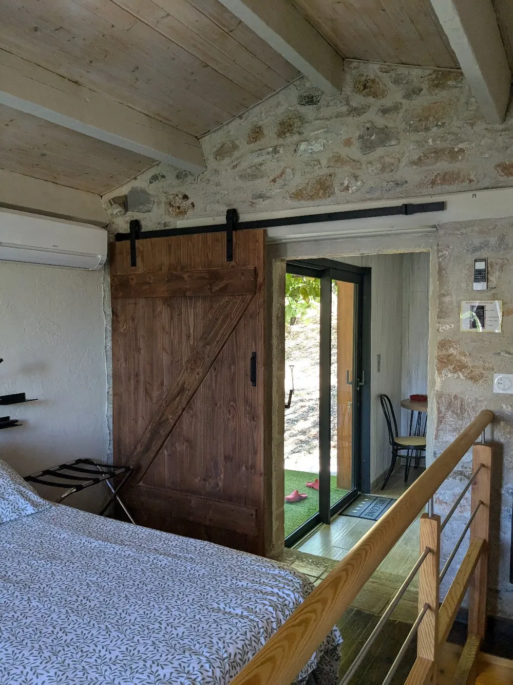 Ancienne maison de vigne atypique au milieu d’un verger de 1 000 m². Lieu calme et reposant pour les amoureux de la nature. Totalement indépendante avec cuisine, salle de bain et WC privé, literie en 160 cm, climatisée. Terrasse ombragée avec vue donnant sur la ville de Millau et son Viaduc. Libre accès à la piscine et jardin. Les propriétaires vous déposent un panier petits déjeuners “maison” devant votre porte tous les matins !
