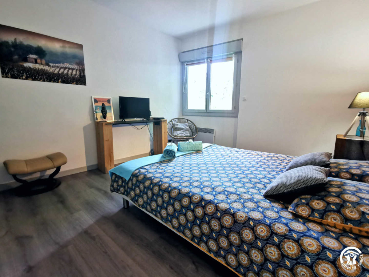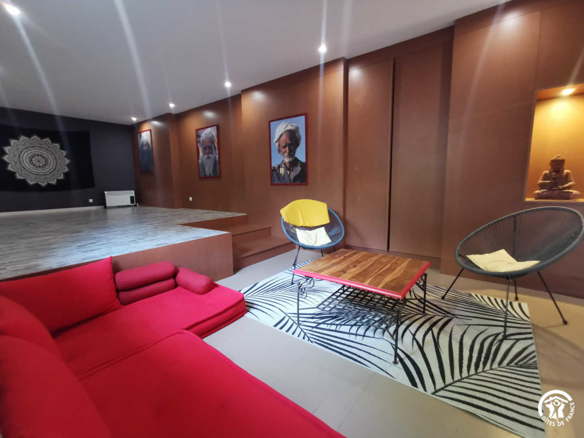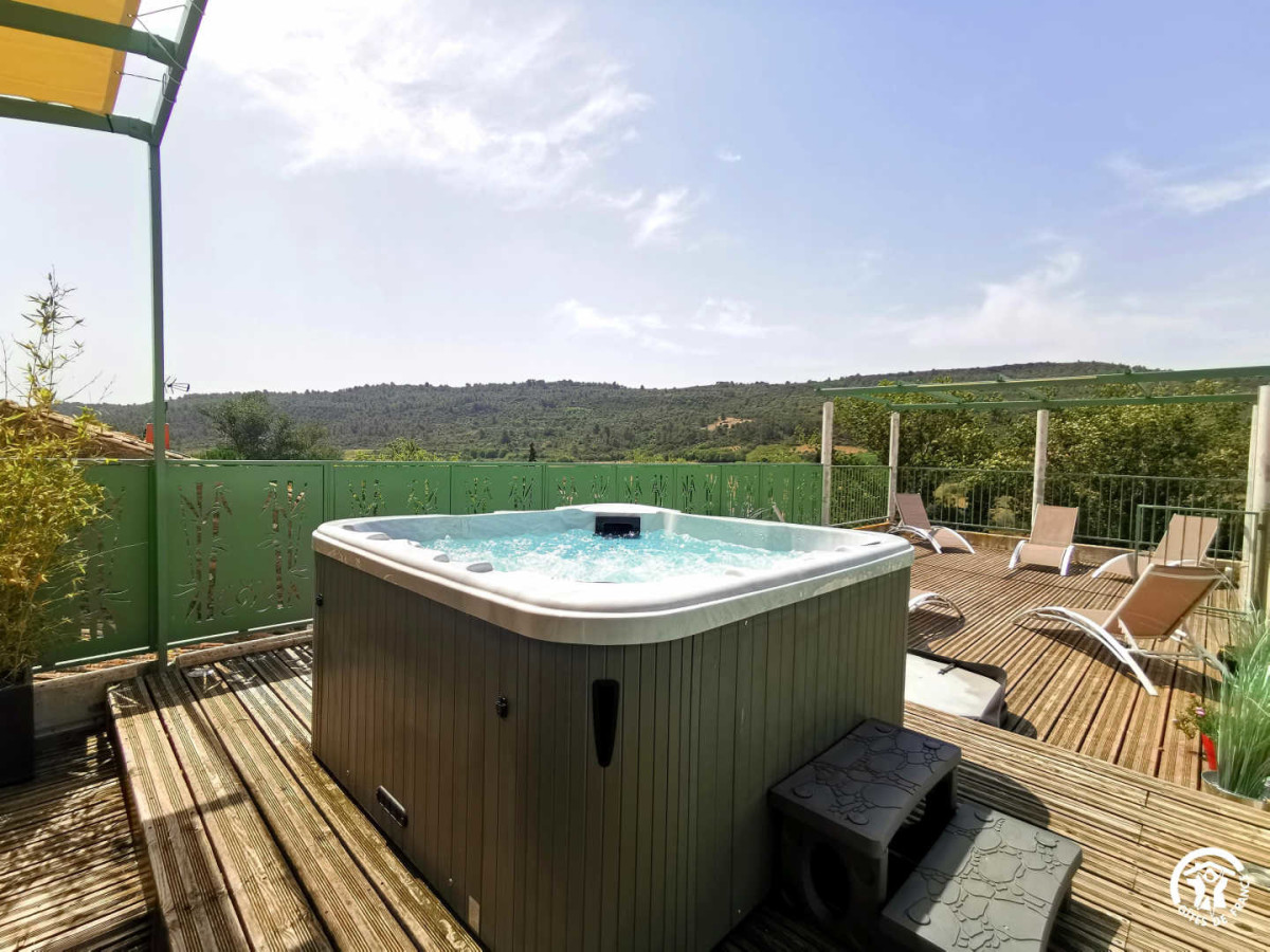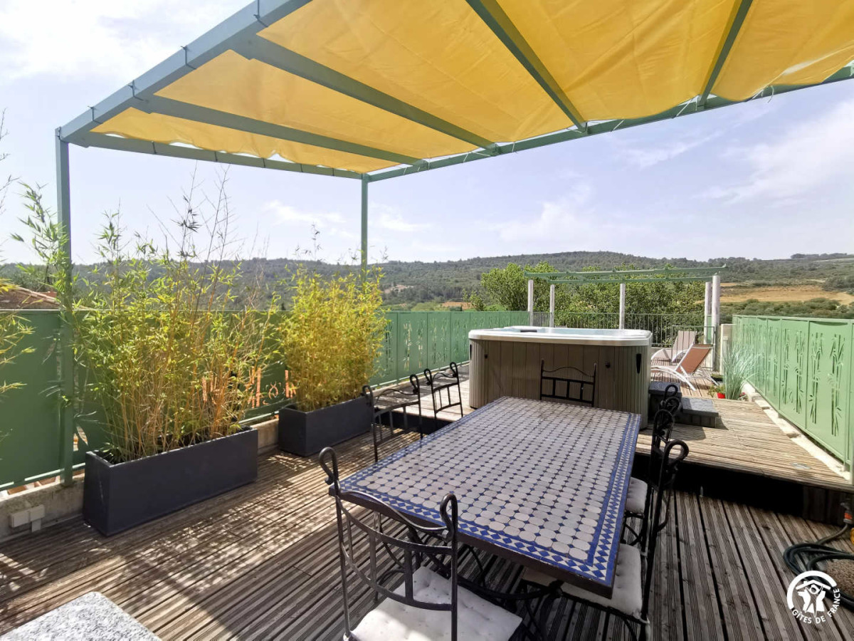 Toutes les chambres sont modulables : en chambre simple avec deux lits jumeaux ou bien en chambre double avec grand lit en 160. Elles sont équipées de téléviseurs, ventilateurs ou climatisation. La chambre CHALET est à part : pas de connexion internet ni de télévision mais une situation idéale en pleine nature à coté de la piscine et réveillée par le chant des oiseaux…une pause dans ce monde trop bruyant. Profitez de la terrasse panoramique avec un point de vue unique sur les environs et sa nature préservée. Cette grande terrasse rooftop est idéale pour bronzer, lire, admirer la vue au rythme du chant des oiseaux. Elle est équipée d’un jacuzzi (5 places), de bains de soleil et d’une cuisine d’été : plancha, bar avec grand évier et table pouvant accueillir de 8 à 10 personnes seront à votre disposition. En journée, parasols et voiles d’ombrage vous permettront d’en profiter. Le soir, la terrasse est illuminée. Vous aurez accès à une cuisine partagée toute équipée ainsi qu’une salle à manger et une salle de yoga avec espace salon. A la demande également, la table d’hôtes au déjeuner ou diner à 20 euros/personne et comprenant : entrée, plats, fromages, desserts, café, infusion et vin. Cuisine qualitative et végétarienne. ATTRAITS TOURISTIQUES : Minerve, fief cathare à 3 km, Narbonne, cité de Carcassonne, lac de Jouarres (base nautique), canal du Midi, Parc Naturel du Haut Languedoc (randonnées, VTT), site escalade, gorges de la Cesse, vignobles (muscat et vins AOC). – Nos trois chambres sont modulables selon vos besoins : en chambre simple avec deux lits jumeaux ou bien en chambre double avec grand lit en 160 cm. elles sont équipées de téléviseurs, ventilateurs ou climatisation. Cette belle chambre ensoleillée vous propose une atmosphère tonique bercée par les embruns des plages landaises ….une invitation à la pratique du yoga pieds nus dans le sable au son des vagues de l’océan….