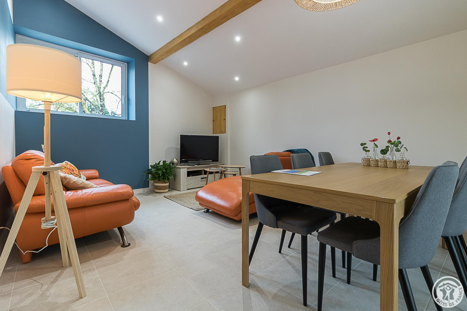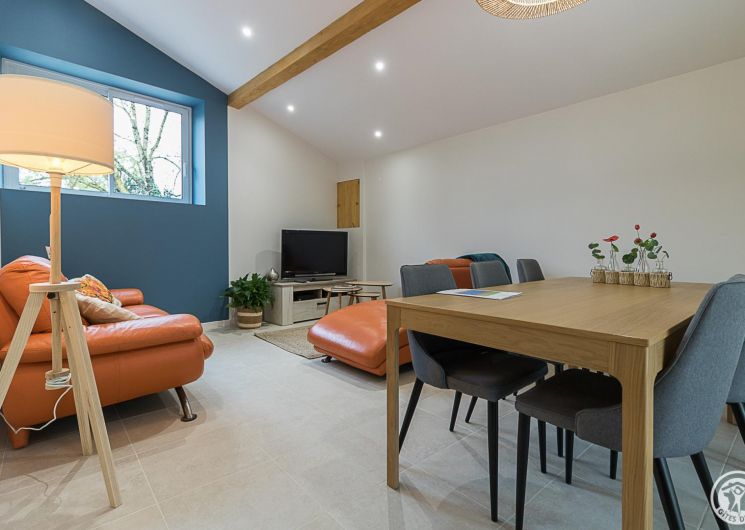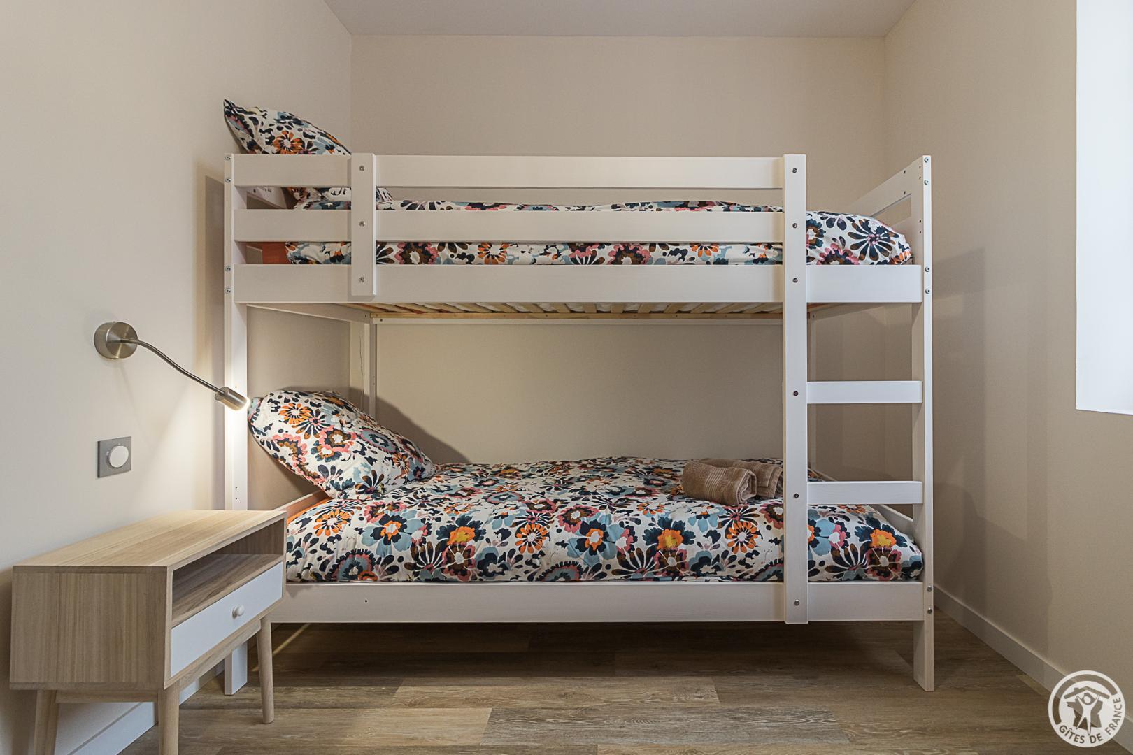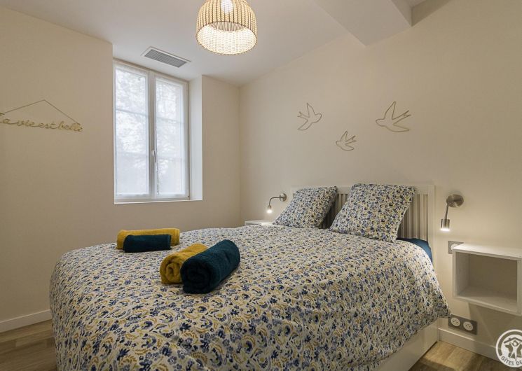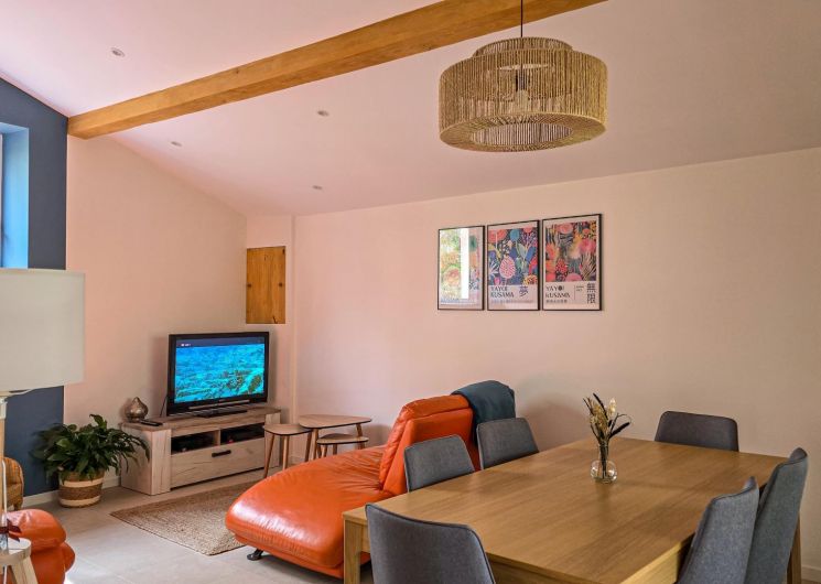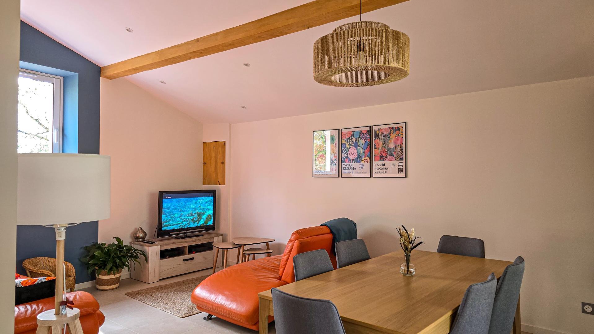 La Maisoun d’Odette es de una sola planta: entrada, cocina, salón con salida a la terraza, 3 habitaciones (2 camas individuales 90x190cm literas) (1 cama doble 160x200cm) (1 cama doble 140x200cm con cuarto de ducha), cuarto de ducha/WC, WC separado. Calefacción por bomba de calor (aire acondicionado reversible). Conexión Internet Wifi. Equipamiento para bebés (cuna y trona). Casa rural para no fumadores.