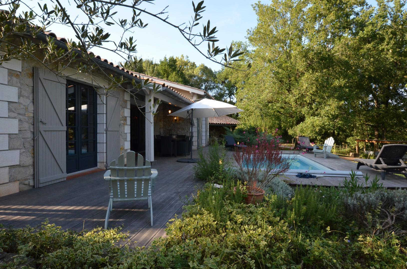 Totalement indépendant, ce gîte a un côté magique, cerné de chênes, avec une belle piscine chauffée tout au long de la saison, rien que pour vous, et une immense terrasse en bois. Votre seul voisin est le local de stockage des ruches, parce que la Montarnaude c’est aussi une histoire de famille d’apiculteurs Bio avec une mieillerie à quelques kilomètres de votre maison de vacances.