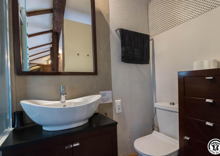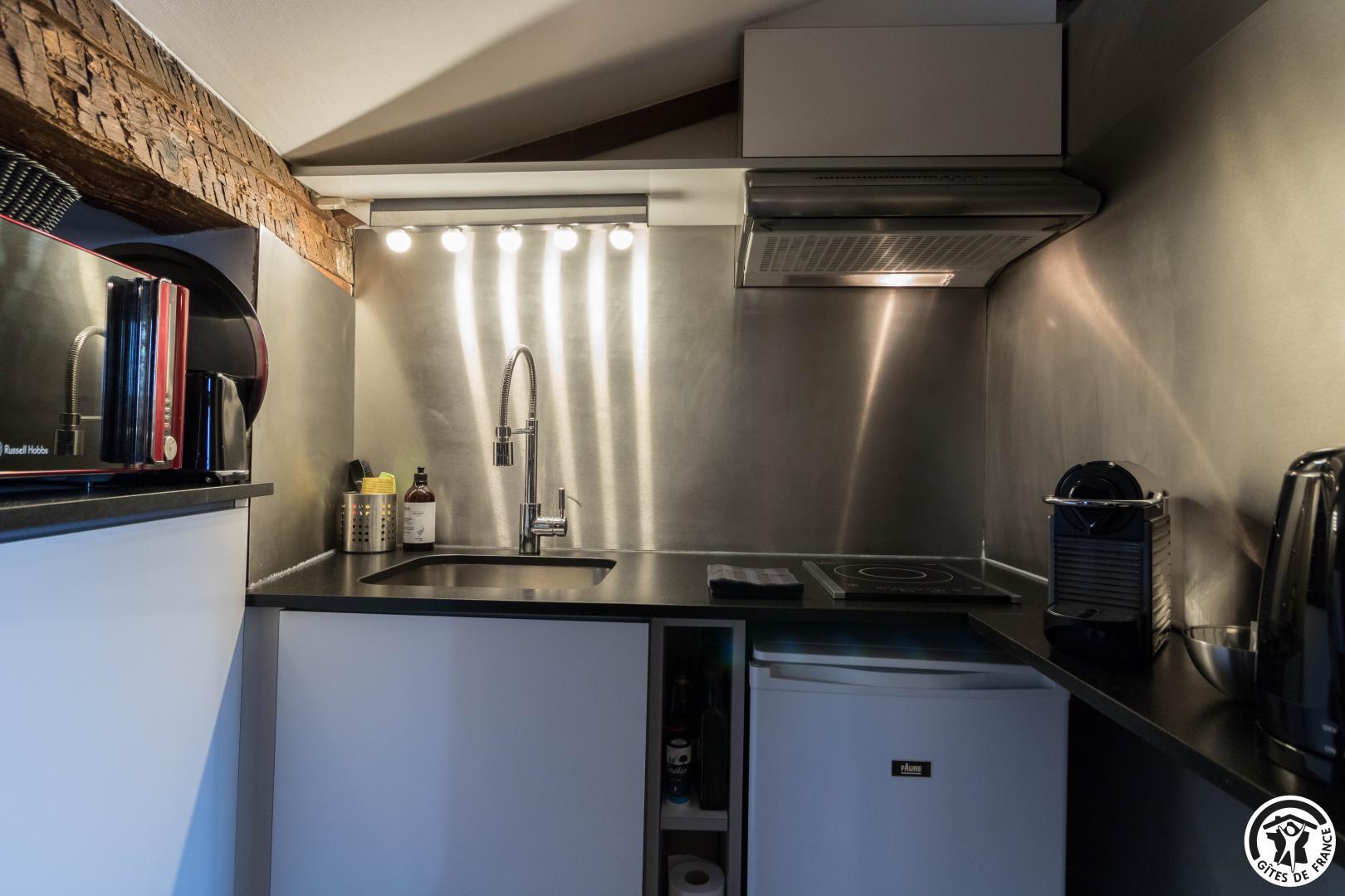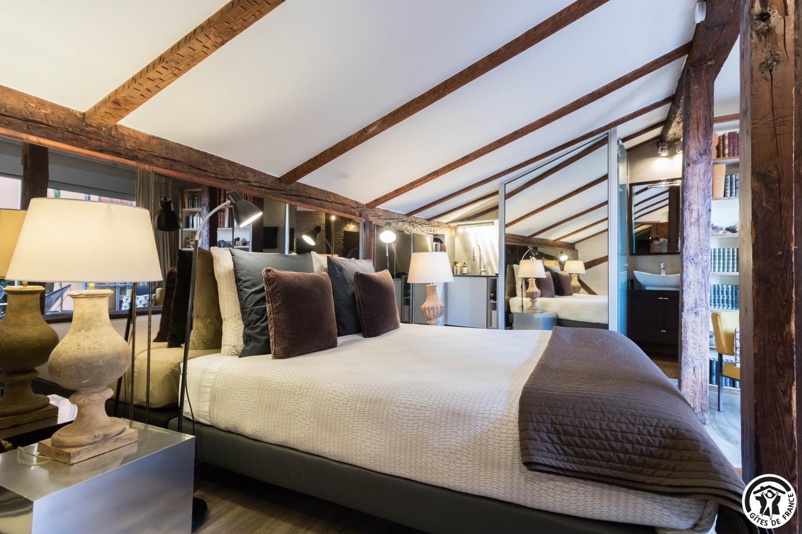 En la 4ª planta de la torre, este luminoso estudio con vistas ininterrumpidas a la ciudad combina autenticidad y modernidad: vigas centenarias, ladrillo visto, cómoda cama de 160 cm, cocina americana totalmente equipada, cuarto de baño contemporáneo con ducha de chorros y WC privado.