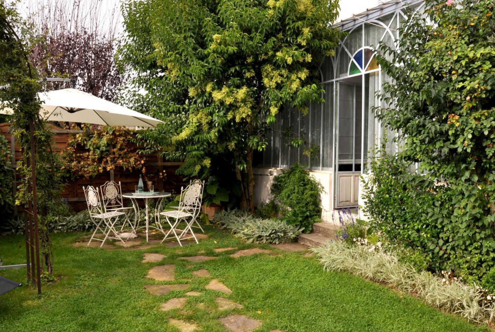 – un petit jardin engazonné, arboré et fleuri avec mobilier de jardin