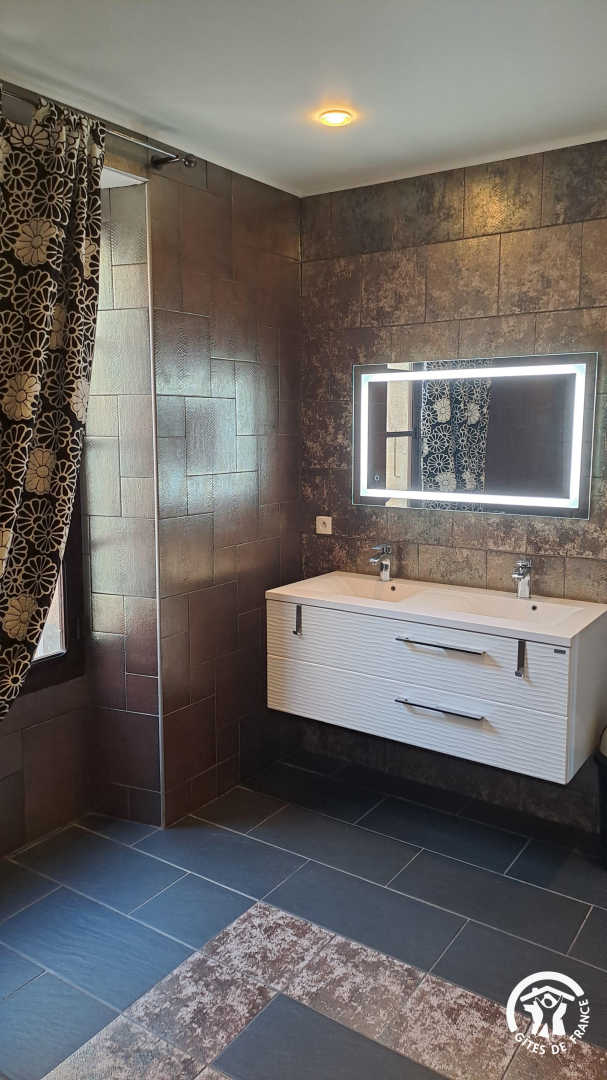A l’étage, un salon (TV, canapé, fauteuils) 3 grandes chambres dont une chambre traversante avec 2 lits (1 lit en 140 / 1 lit en 160) deux grandes chambres (1 lit en 160 chacune et un dressing) une grande salle d’eau (douche italienne, lavabo double vasque) et un wc indépendant.