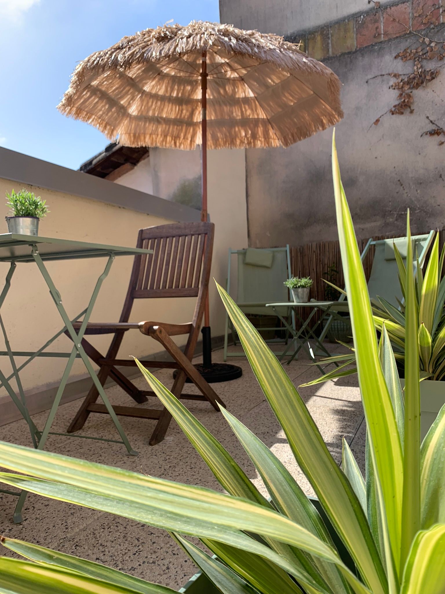 Al llegar al 3er piso, el apartamento está frente a la escalera. La puerta se abre a un espacio abierto (24 m2) con una entrada que da acceso a la sala de estar compuesta por una cocina abierta, una sala de estar y un comedor. Esta habitación da acceso al gran balcón de la azotea, un espacio con vistas a las azoteas y al patio interior acondicionado con una zona de comedor y una zona de relajación con 2 tumbonas.