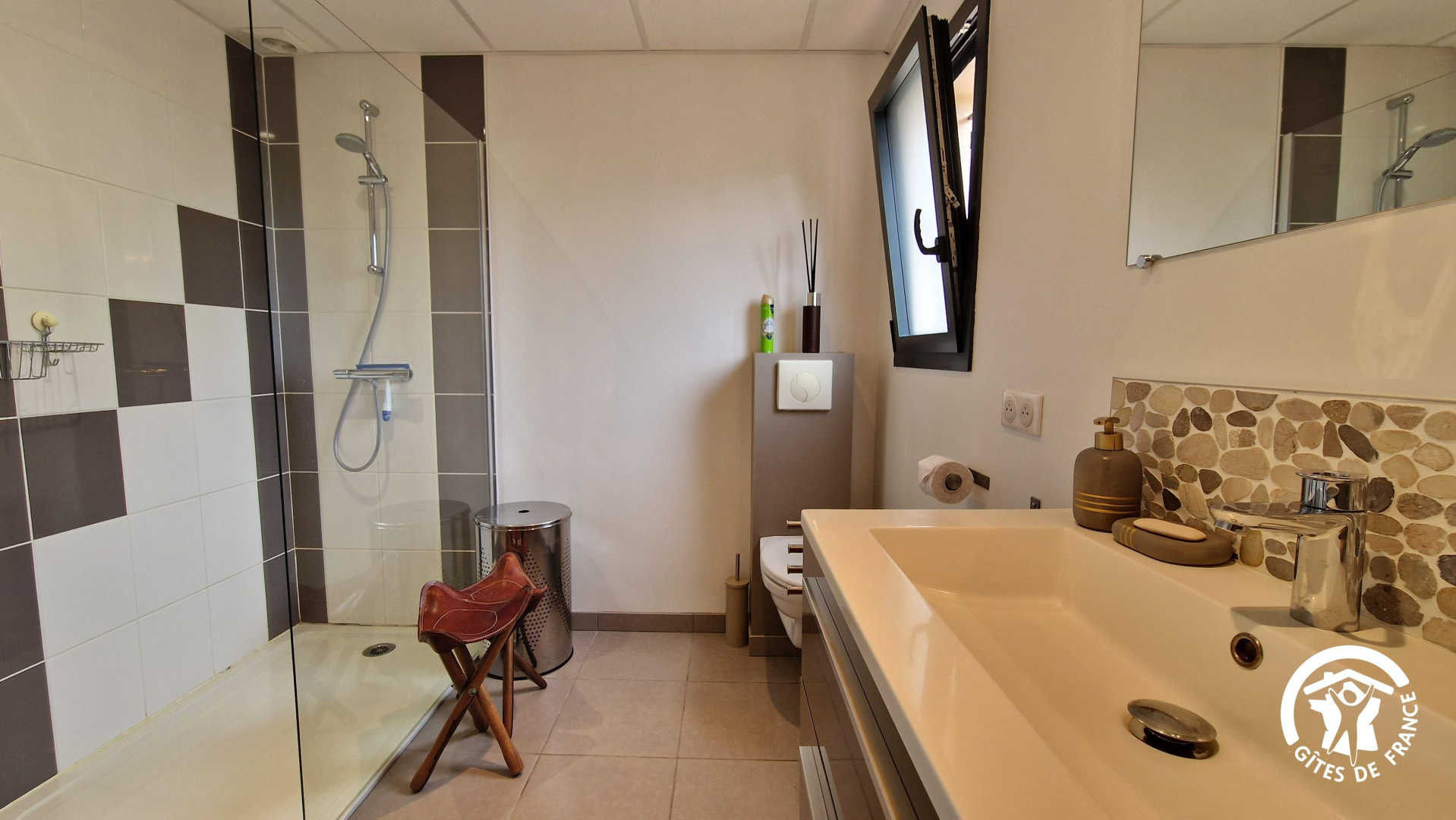– Une grande salle d’eau avec douche, WC et vasque.