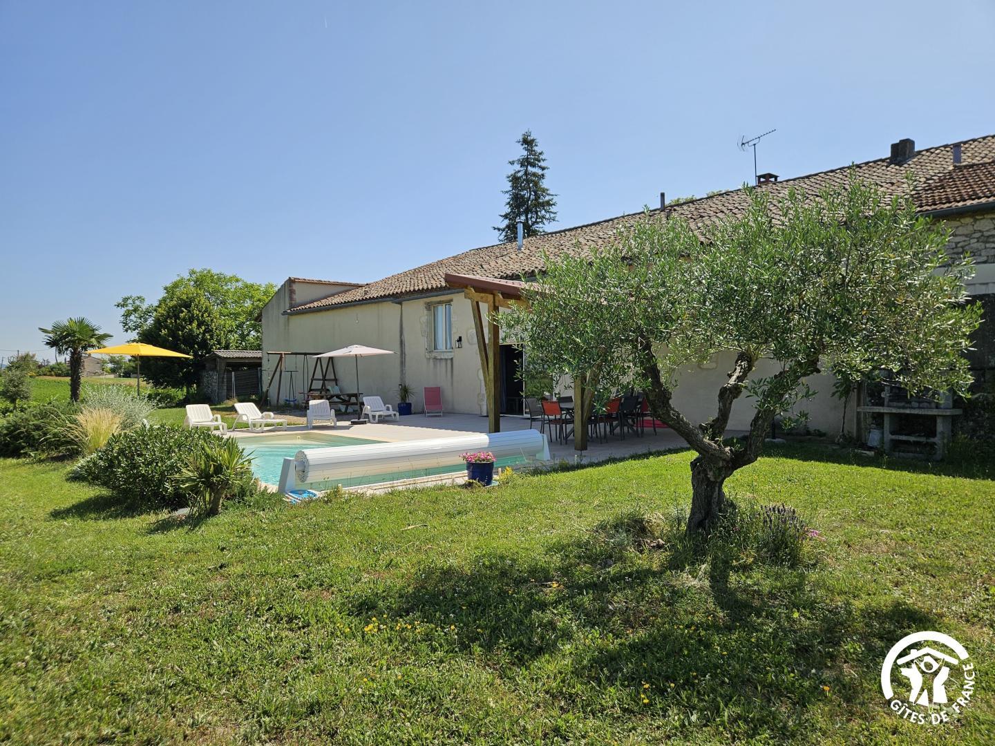 Extérieur : environ 1 hectare de terrain entoure le gîte avec jardin (non clos), salon de jardin, piscine, bains de soleil, barbecue, portique et poules. Table de ping-pong sous un hangar couvert.