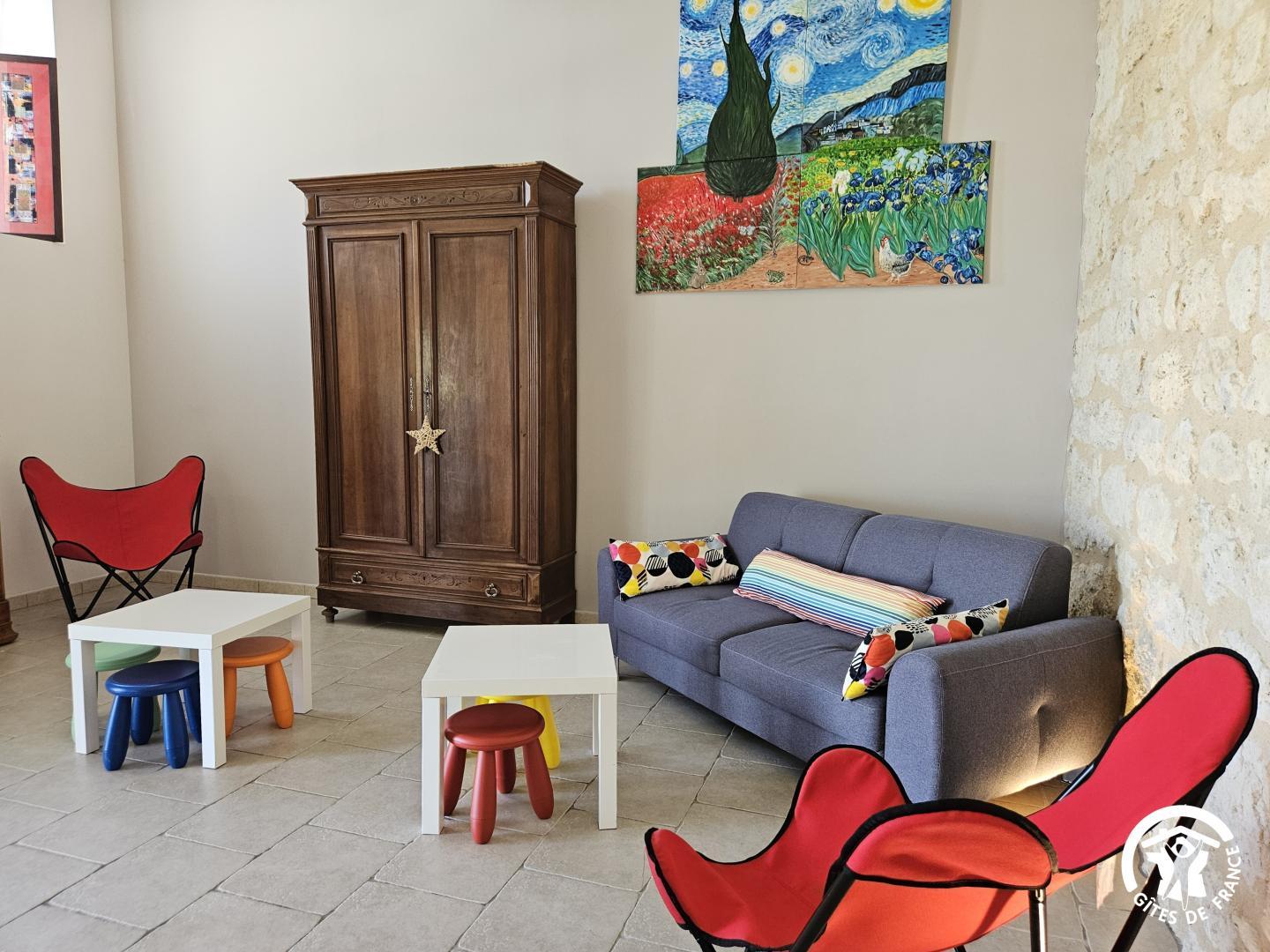 – Grande et haute pièce de vie toute en pierre apparente de 40 m² donnant sur la terrasse de la piscine avec jeux de sociétés.
