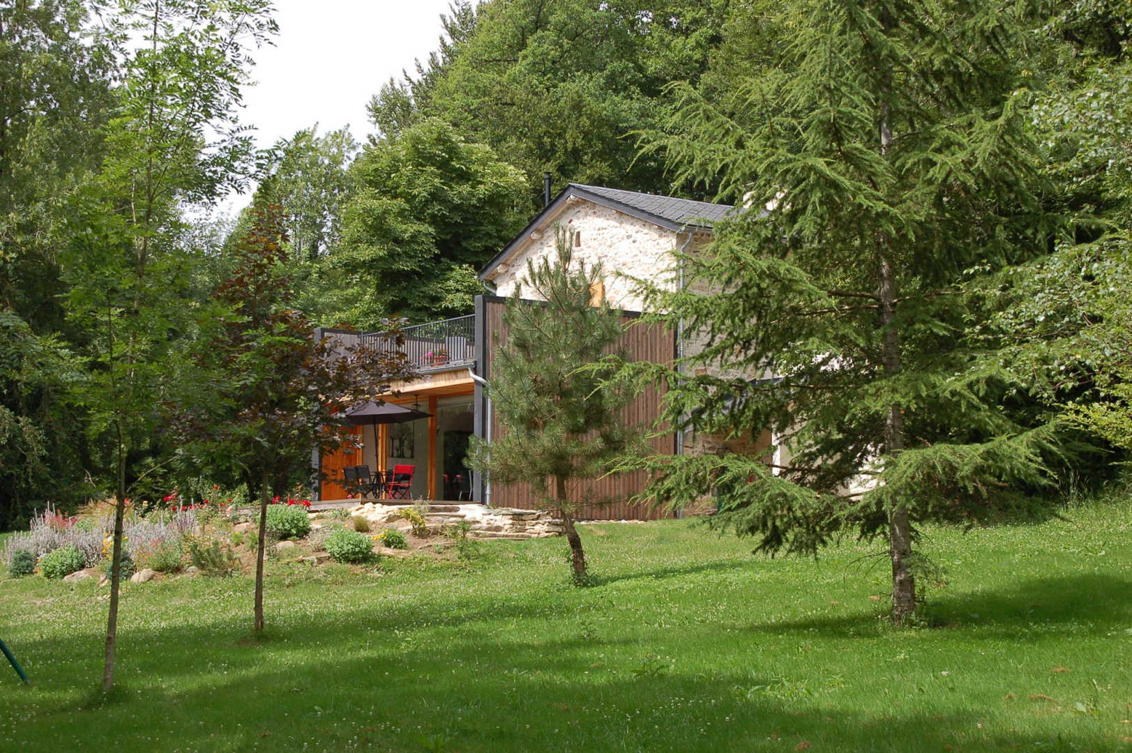 Mélange réussi entre éléments patrimoniaux (potager et évier en pierre, four à pain) et extension contemporaine. Belle terrasse en bois, jardin.