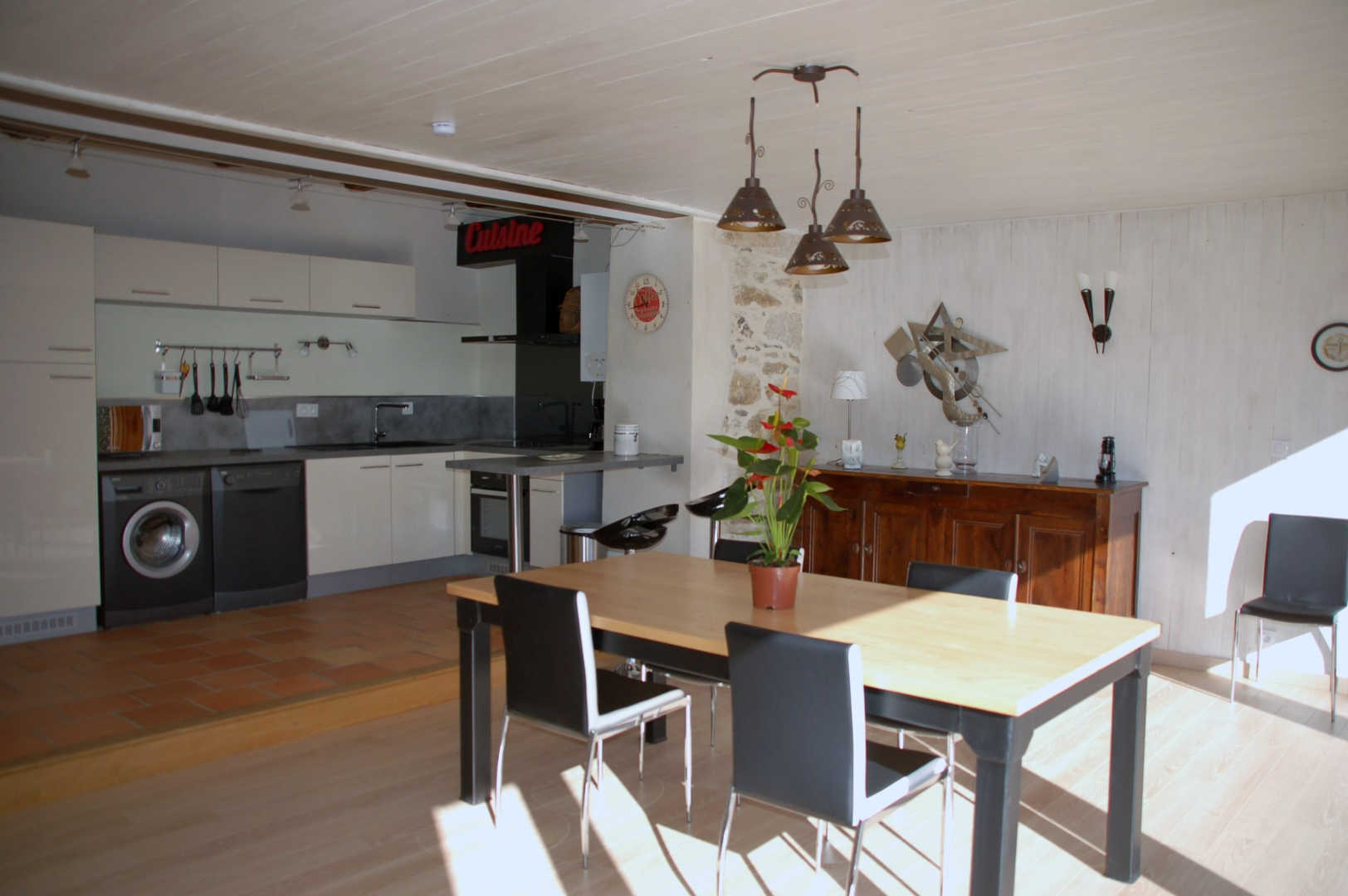 Grand séjour avec cuisine ouverte moderne et toute équipée, salon en rez-de-chaussée.