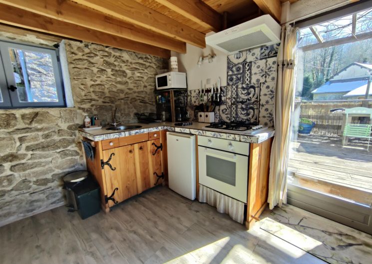Le gîte, chaleureux et coquet, est conçu pour accueillir deux personnes et se rejoint par quelques marches en pas japonais menant à la terrasse d’entrée.