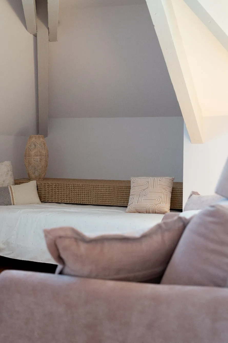 Le grenier de notre enfance : univers chaleureux, de jolies poutres, des matières nobles, dans un univers spacieux, moderne et lumineux, une température idéale quelle que soit la saison (climatisation) et une ouverture sur l’extérieur (velux).