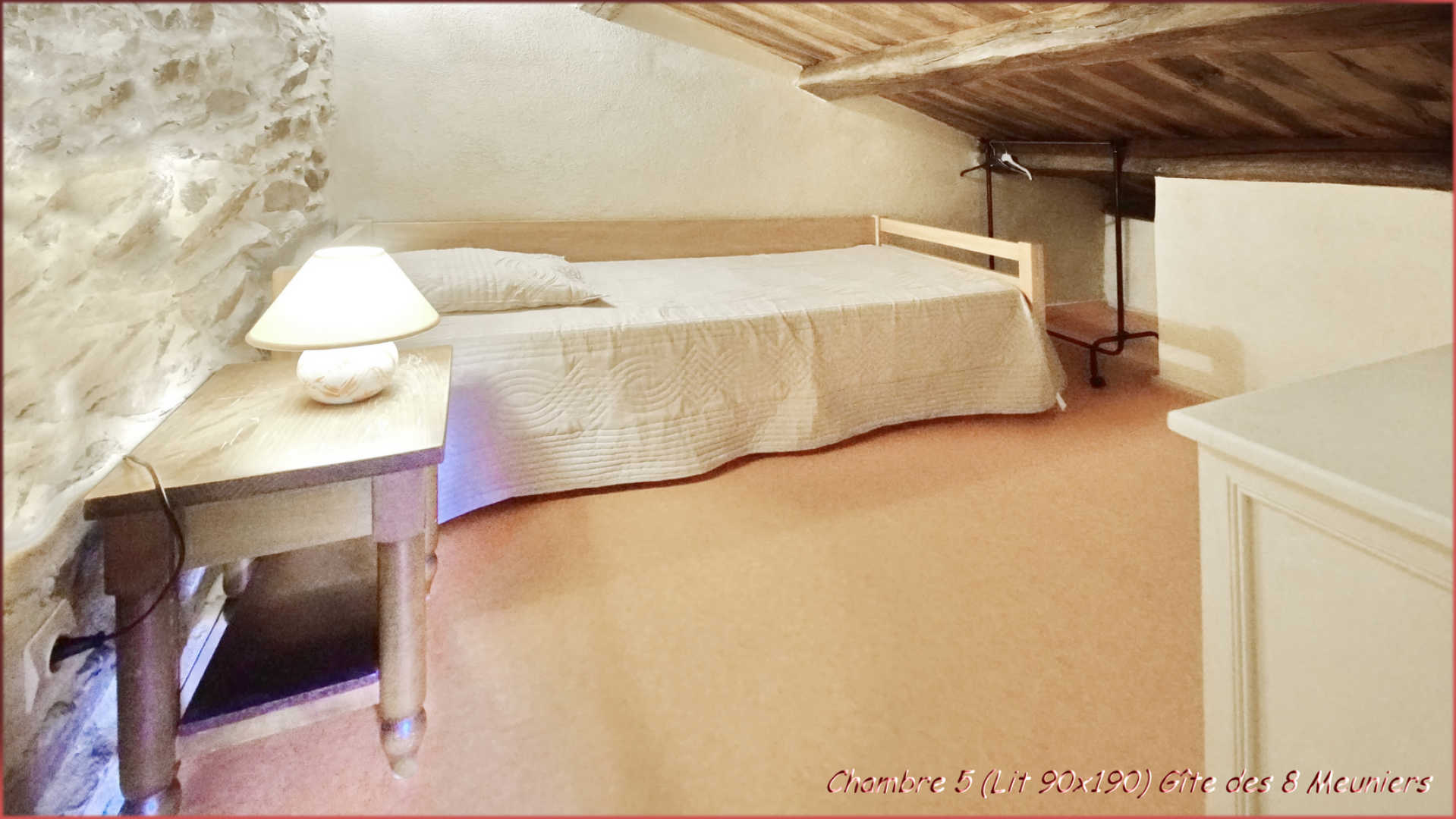 5 dormitorios con cama doble (140×190), 1 dormitorio con 2 camas individuales (90×190), 3 dormitorios con 1 cama individual (90×190).