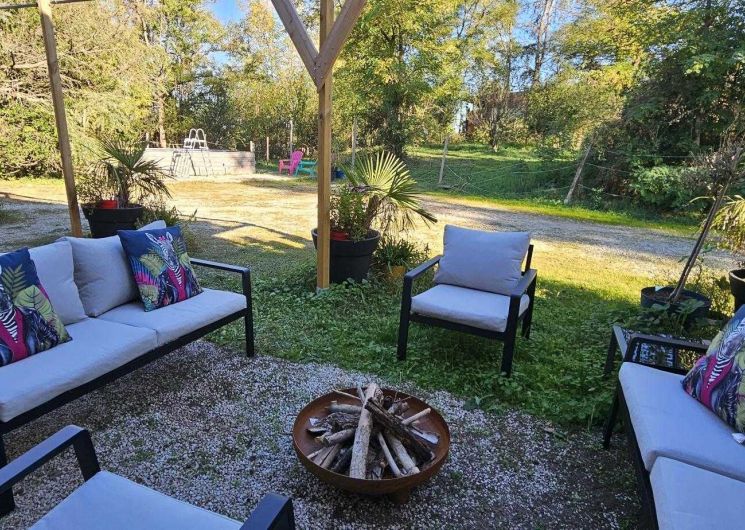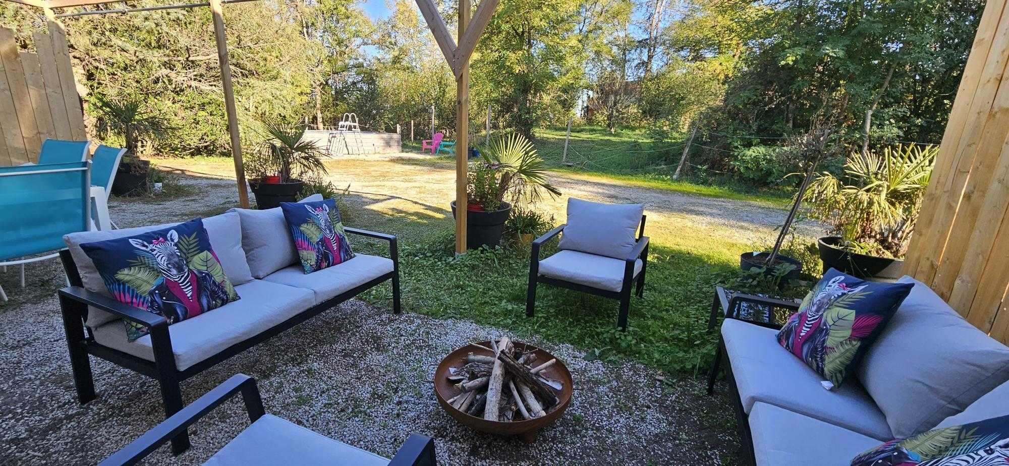 En el exterior: una terraza bien equipada (zona comedor y salón exterior bajo lona de sombra), una piscina tubular (4×2 m, 0,80 m de profundidad), una plancha y acceso a la zona de ocio del club (futbolín, billar). Un lugar sencillo, animado y acogedor para unas vacaciones en el Tarn rural.