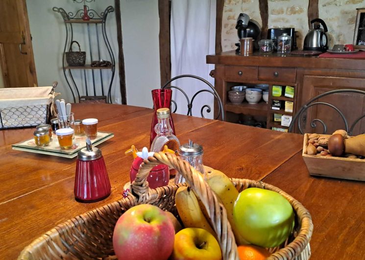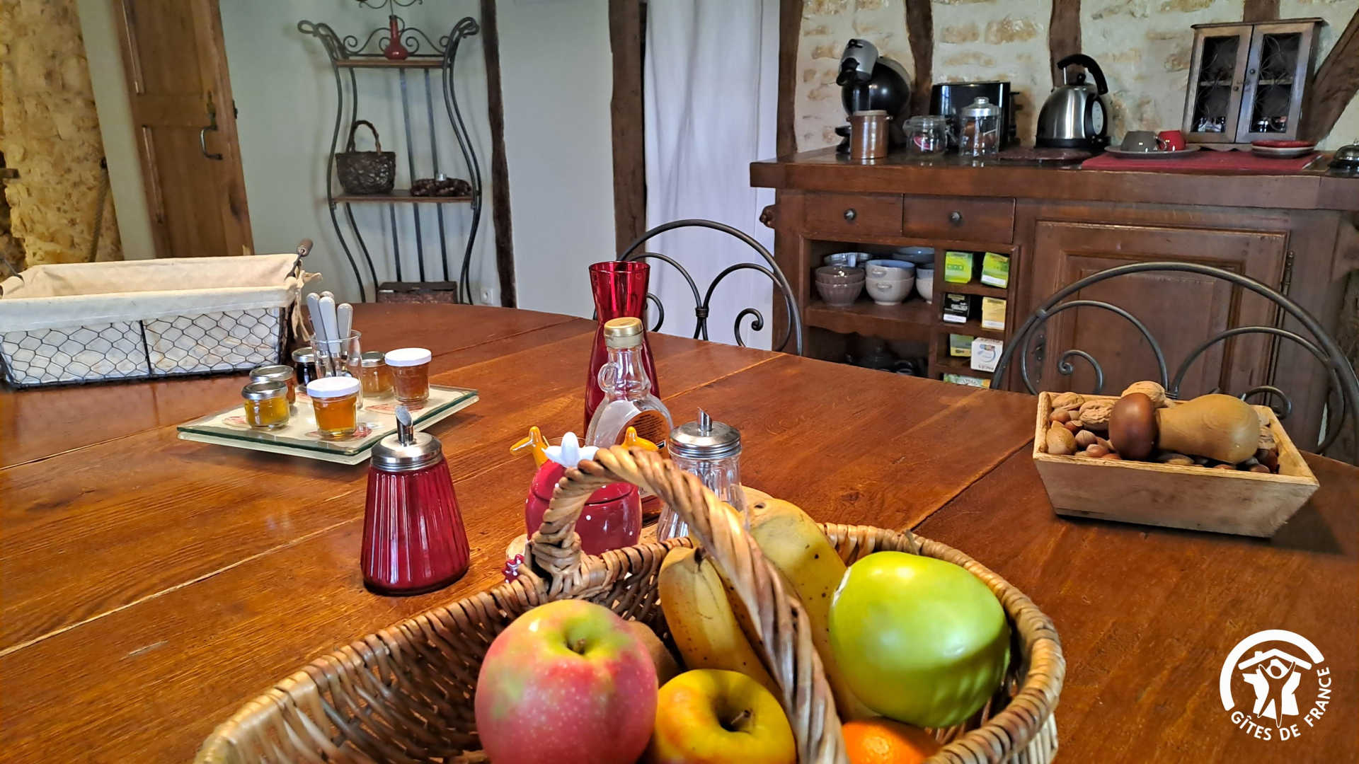 Chambre Entre Parenthèse pour trois personnes, et chambre Vers le Bonheur pour deux personnes. Table d’hôtes sur réservation. C’est avec son tablier et ses casseroles que Stéphanie règne dans la cuisine… De bons petits plats préparés avec amour, des recettes et un plaisir à cuisiner : un héritage laissé par sa grand-mère… Ici, la convivialité passe aussi par les casseroles… Le domaine du service est réservé à Jean-Louis qui, avec sa bienveillance naturelle, son sourire et son accent chantant mettra tout en oeuvre pour vous satisfaire.