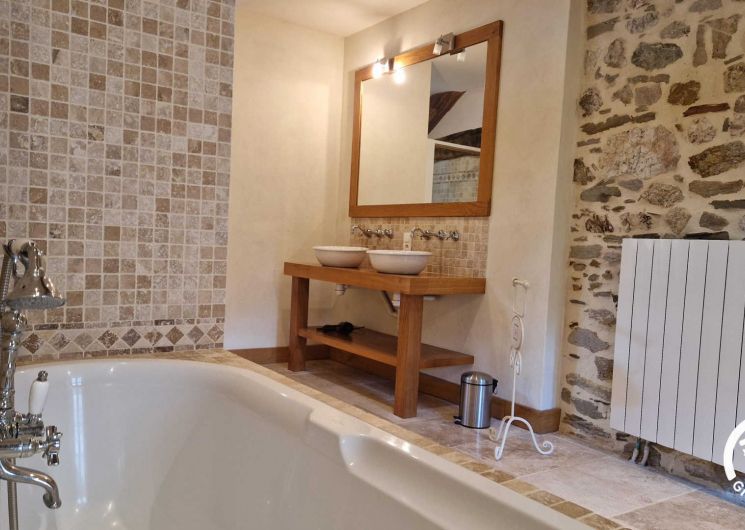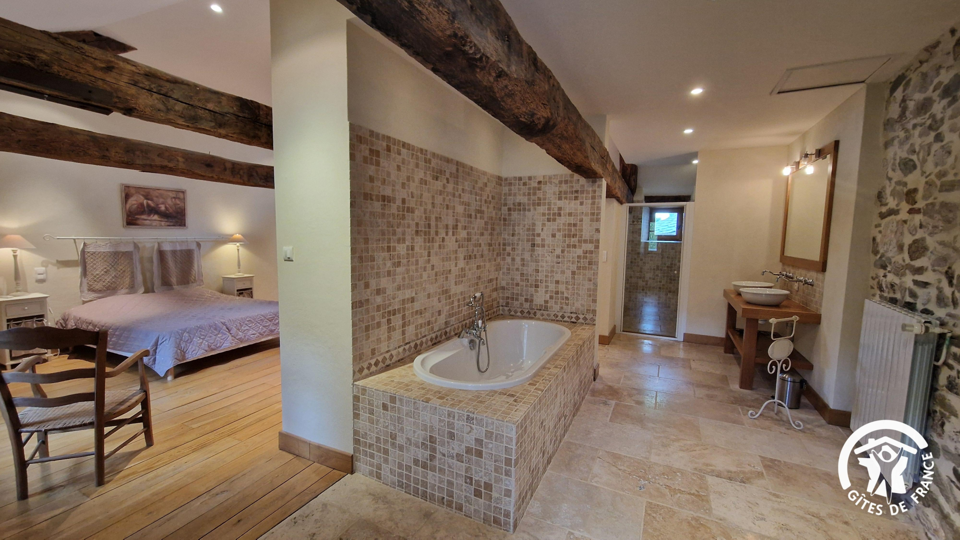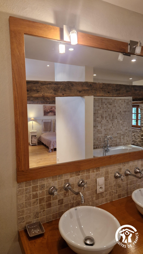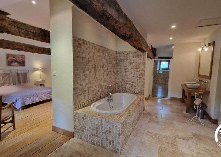 – A l’étage, une superbe chambre avec lit en 160cm et salle de bain ouverte. Une belle baignoire, une grande douche et deux vasques.