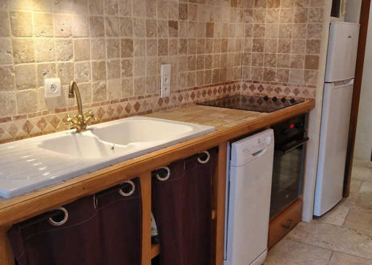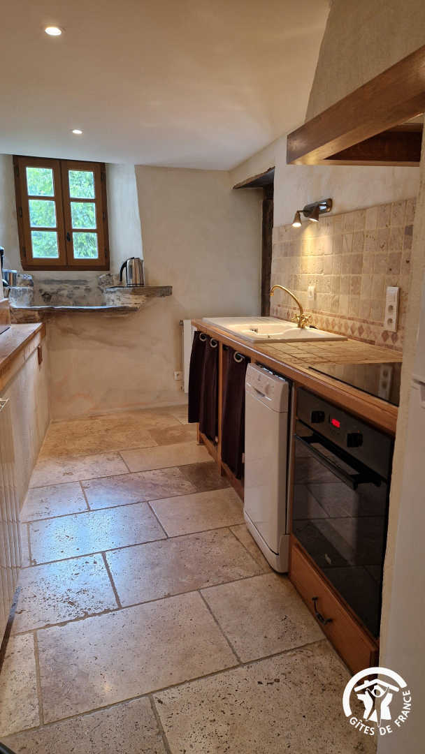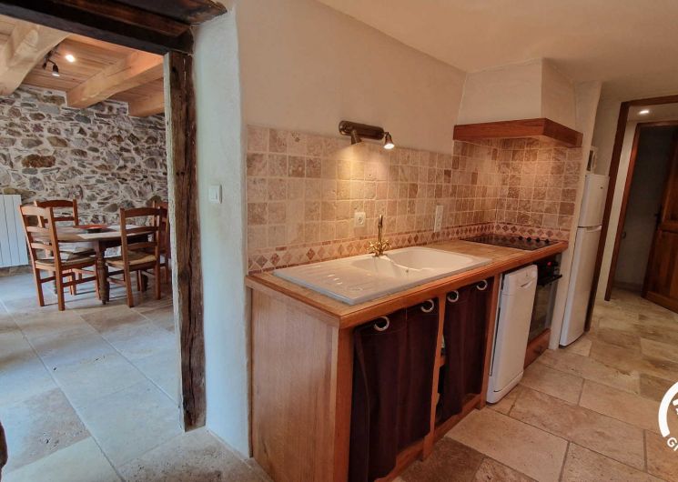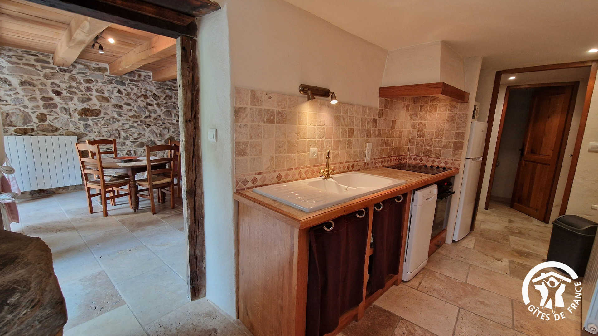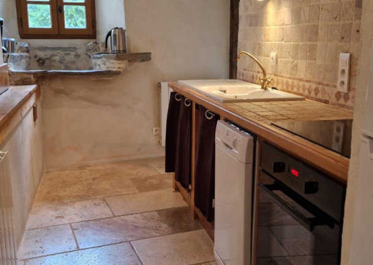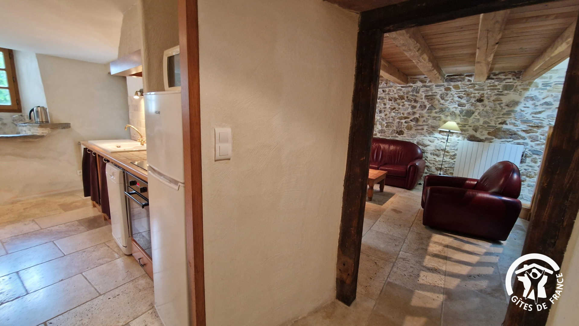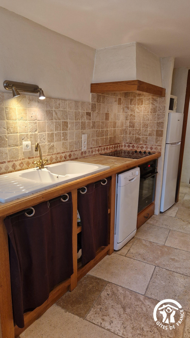 – Rez-de-chaussée : séjour avec table à manger, salon avec cheminée fonctionnelle et TV. Derrière la cheminée, la cuisine tout en long et équipée : four, réfrigérateur avec congélateur, petit lave-vaisselle, micro-ondes, bouilloire et cafetière à dosettes Senseo®. Buanderie (lave-linge, sèche-linge), wc.