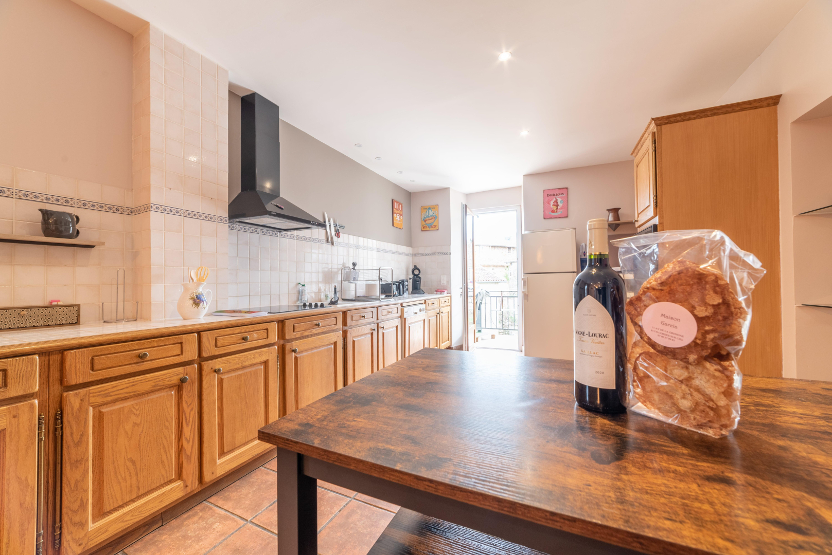 LA CAZA : l’accès se fait depuis la cuisine avec son ilot central pour manger. Cuisine avec équipement complet pour mijoter des bons petits plats : four, plaque à induction, micro-onde, cafetière Senseo®, lave-vaisselle. Un accès à une petite terrasse attenante au gîte et son barbecue au charbon.