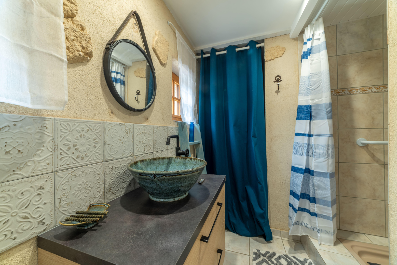 A l’étage, l’espace nuit et une seconde salle de bain avec sa baignoire sur pied et machine à laver.