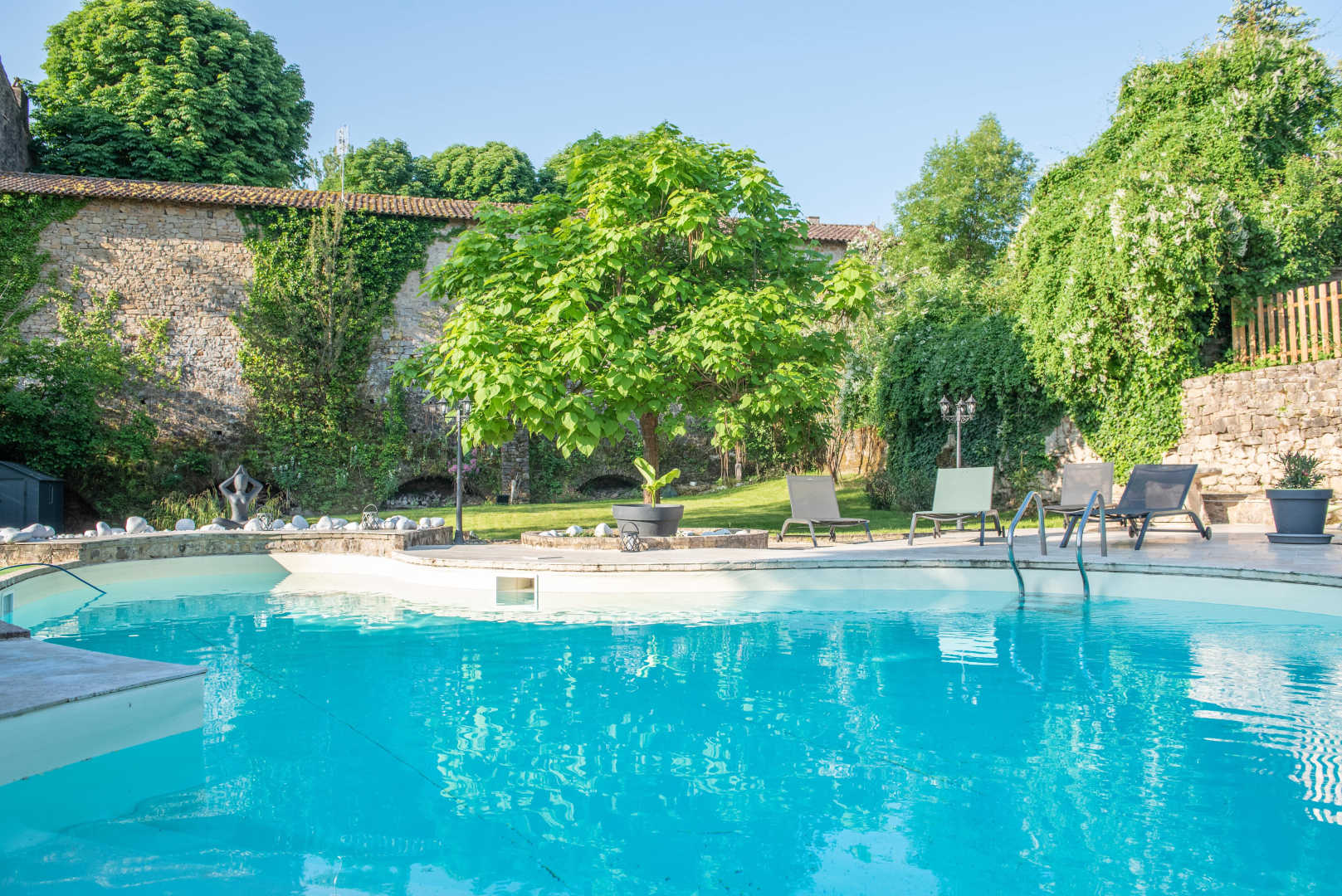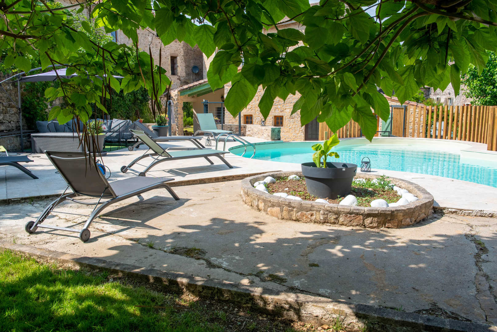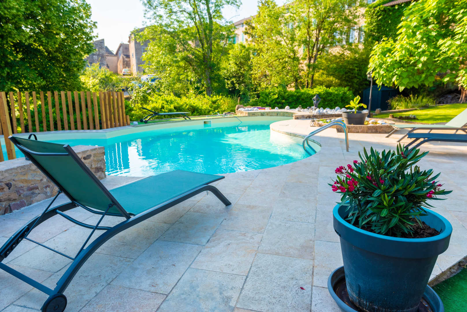 Piscine avec fond plat de 1,40m de profondeur et plage. Chauffée d’avril à octobre, sécurisée avec une barrière. Piscine accessible de 10h à 22h.