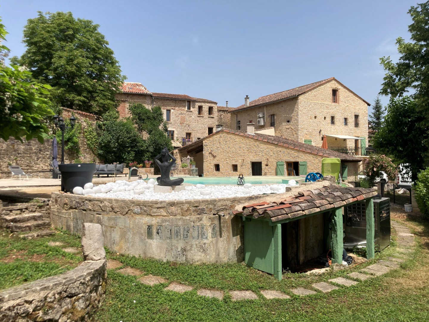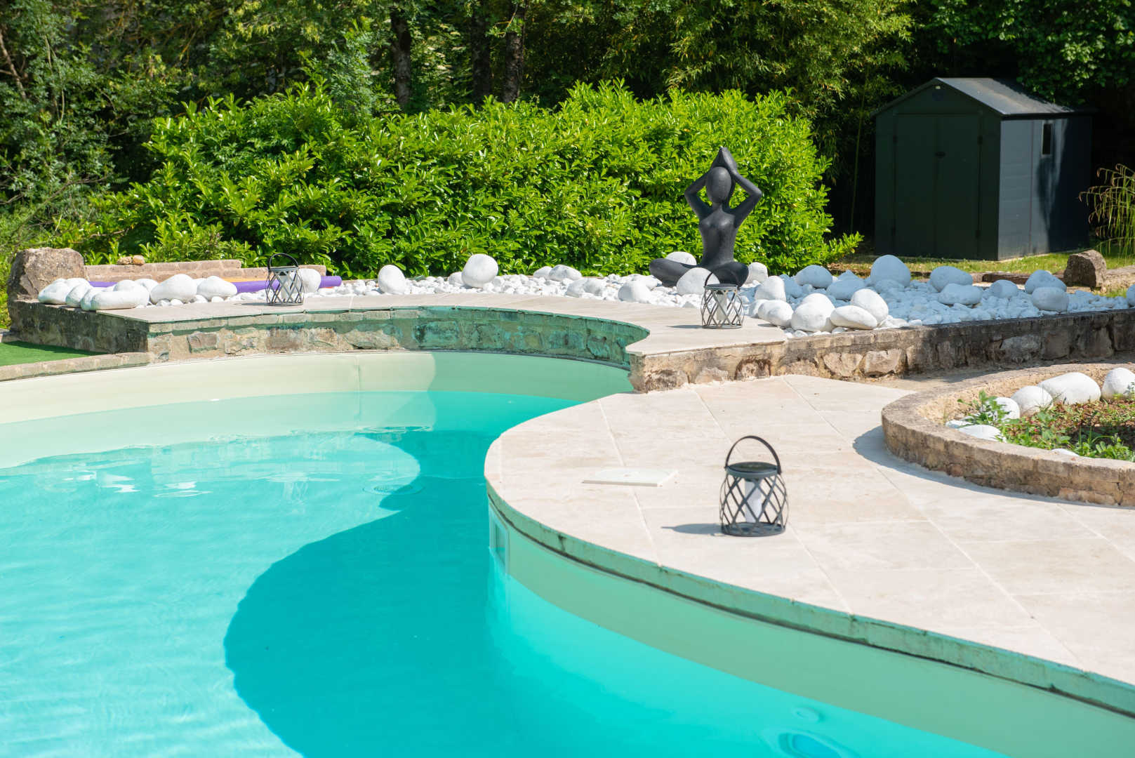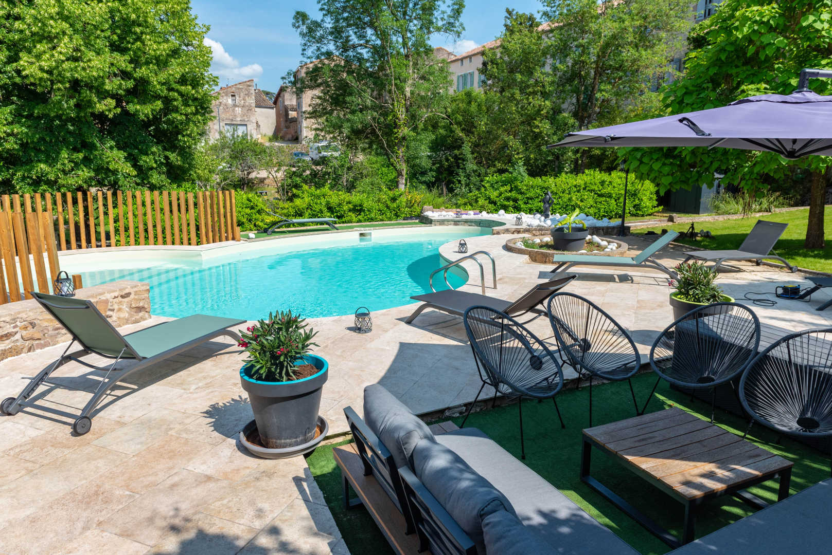 Piscine avec fond plat de 1,40m de profondeur et plage. Chauffée d’avril à octobre, sécurisée avec une barrière. Piscine accessible de 10h à 22h.