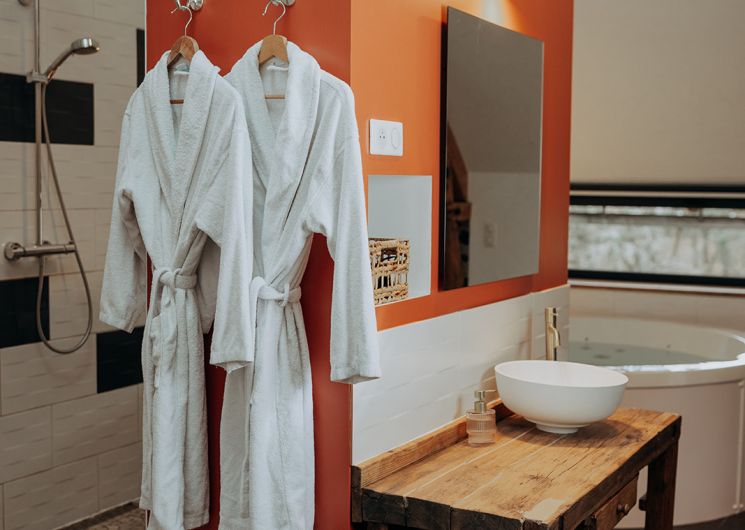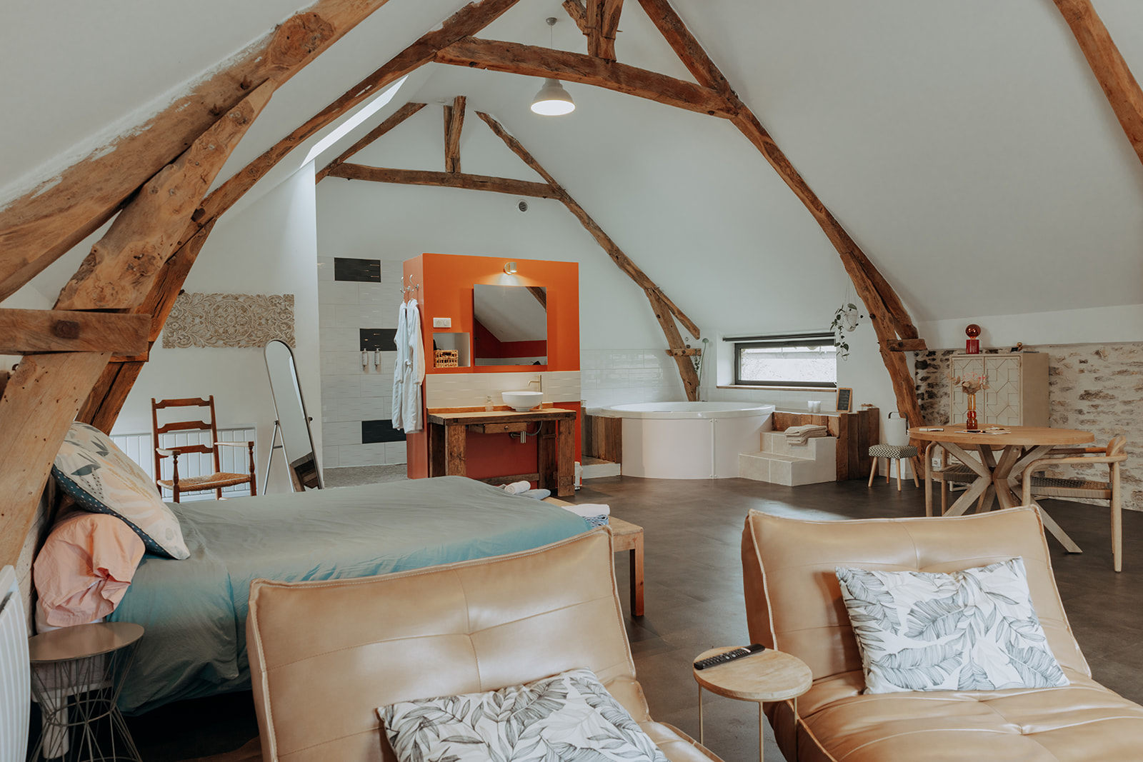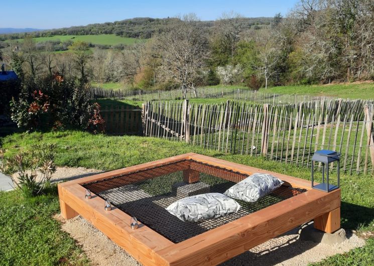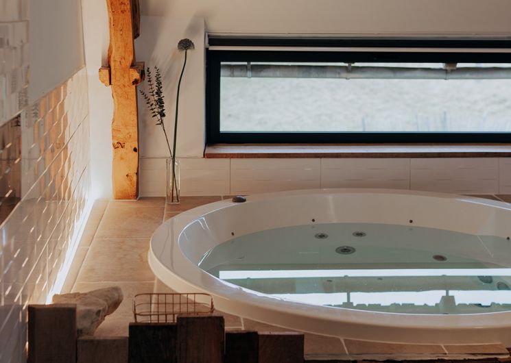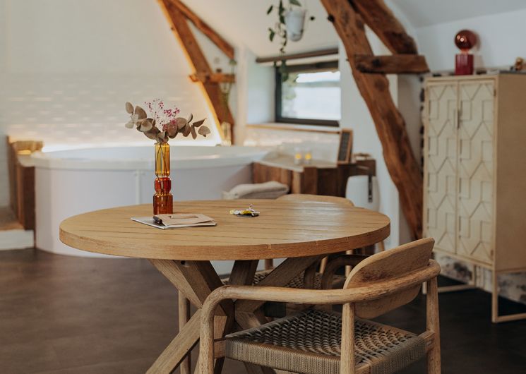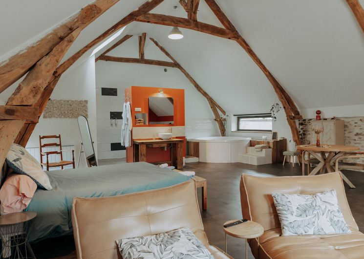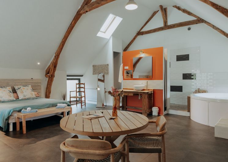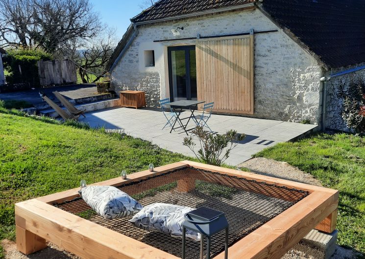 La SUITE avec jacuzzi occupe une partie de l’étage de notre grange quercynoise. Après avoir emprunté quelques marches taillées à même le rocher du causse de Martel, vous découvrez votre terrasse privative sans vis à vis entièrement équipée et faites face à un des pignons de la grange qui s’ouvre sur votre hébergement. Sur plus de 70 m², celui-ci est un vaste espace sans cloison où la chambre, le salon, la salle de bain, le jacuzzi intérieur et le coin cuisine ont été aménagés de manière à préserver les volumes et l’architecture traditionnelle. Le jacuzzi est à votre entière disposition pour de délicieux instants de détente de jour comme de nuit, été comme hiver. La terrasse est complétée par un filet de détente extérieur, pour admirer le panorama, observer les étoiles ou une sieste bercés par les sons de la nature environnante.