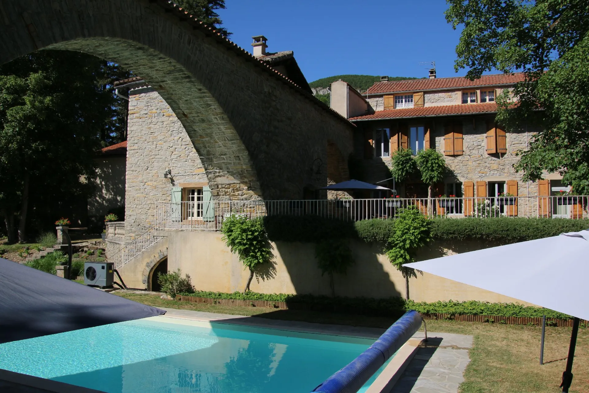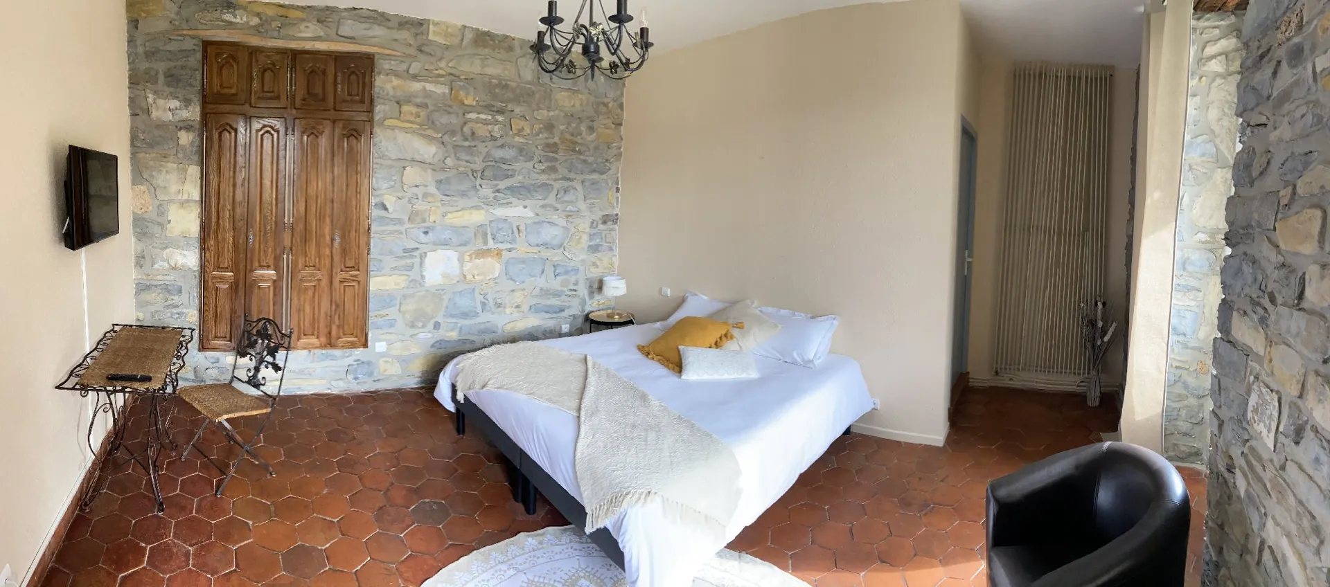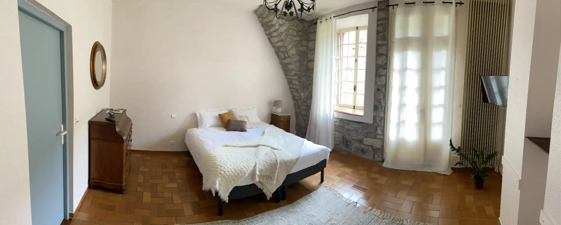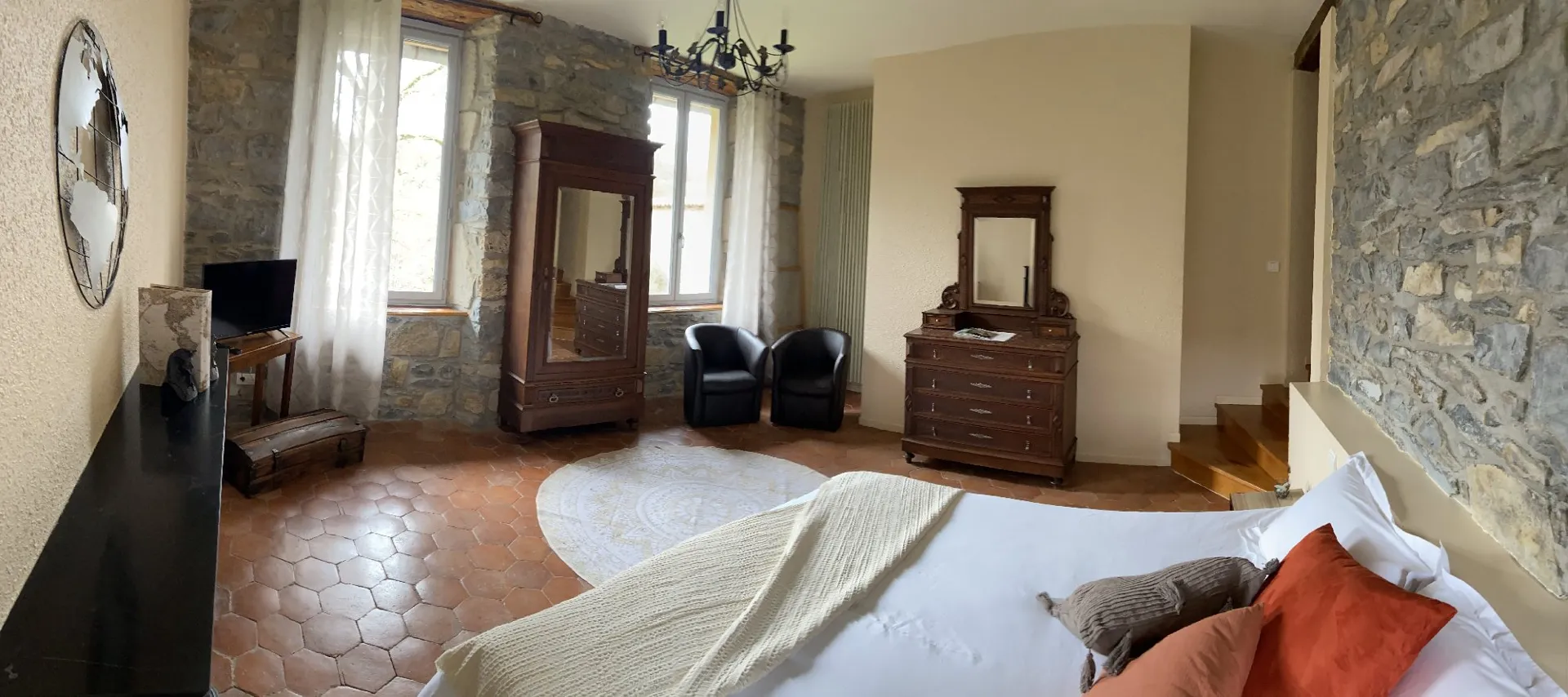 En la primera planta de la casa principal, os proponemos 5 habitaciones amplias y luminosas, cada una con su cuarto de baño y aseos privados. La finca de 1,5 ha. dispone de una piscina grande, de terrazas soleadas, una pista para jugar a la petanca, un parking con sombra y un cobertizo cerrado para bicis y motos.
