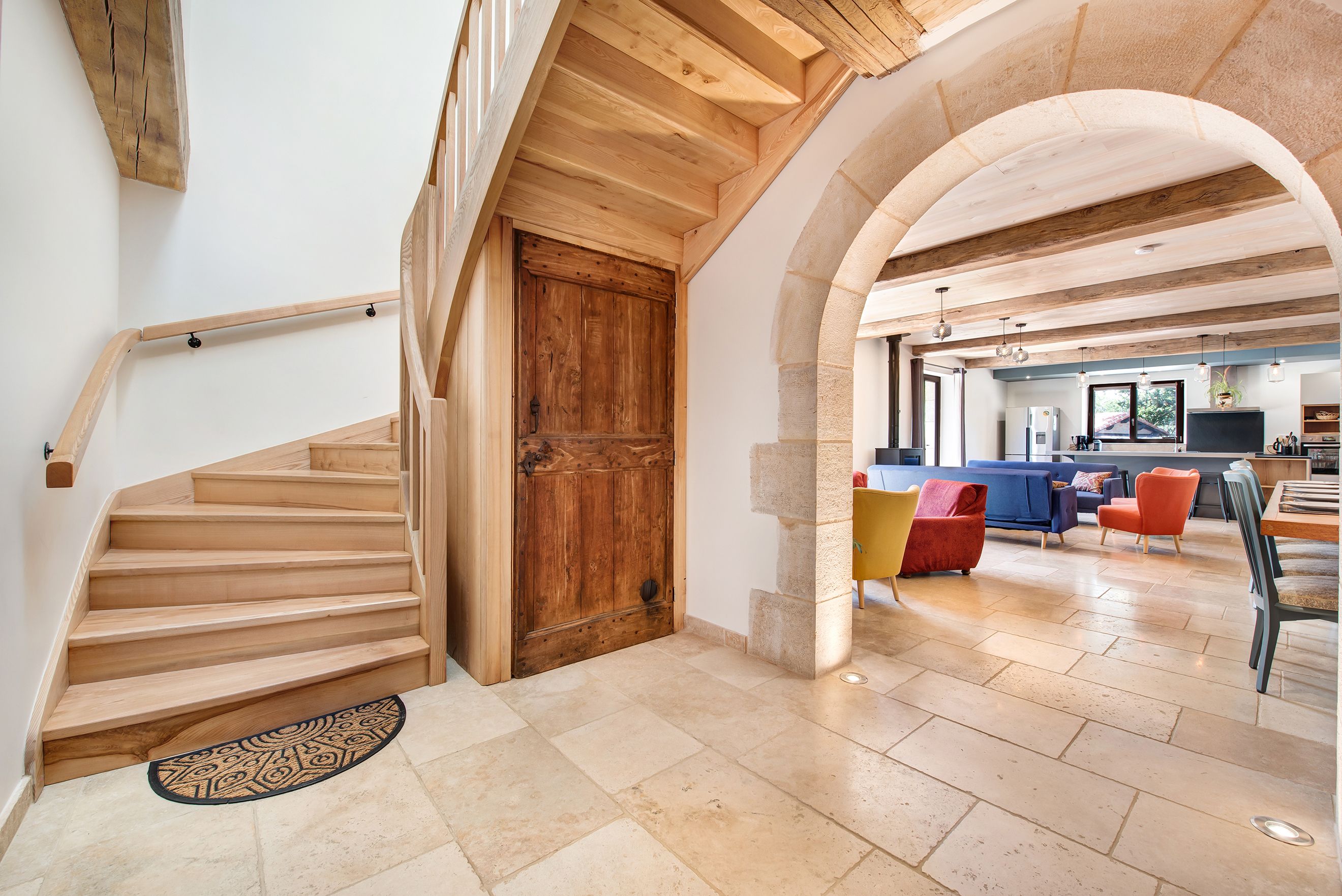 Hermosa casa de piedra totalmente renovada con en la planta baja, un salón de entrada que da acceso a una sala de estar con sala de estar (2 sofás de 3 asientos en ambos lados de una estufa de leña, 4 sillones, mesa de café, TV, reproductor de DVD, satélite) , Área de cocina (elementos integrados, lavavajillas, microondas, refrigeradores, congelador), un comedor con mesa grande y 16 sillas). Acceso a la lavandería (secadora y lavadora) y un armario grande en la entrada. 1 inodoro con lavado de manos y secador de toallas en la planta baja. 2 habitaciones accesibles para personas con movilidad reducida (1 cama 140 cada una con baño privado y WC). Espacio de almacenamiento debajo de la escalera.