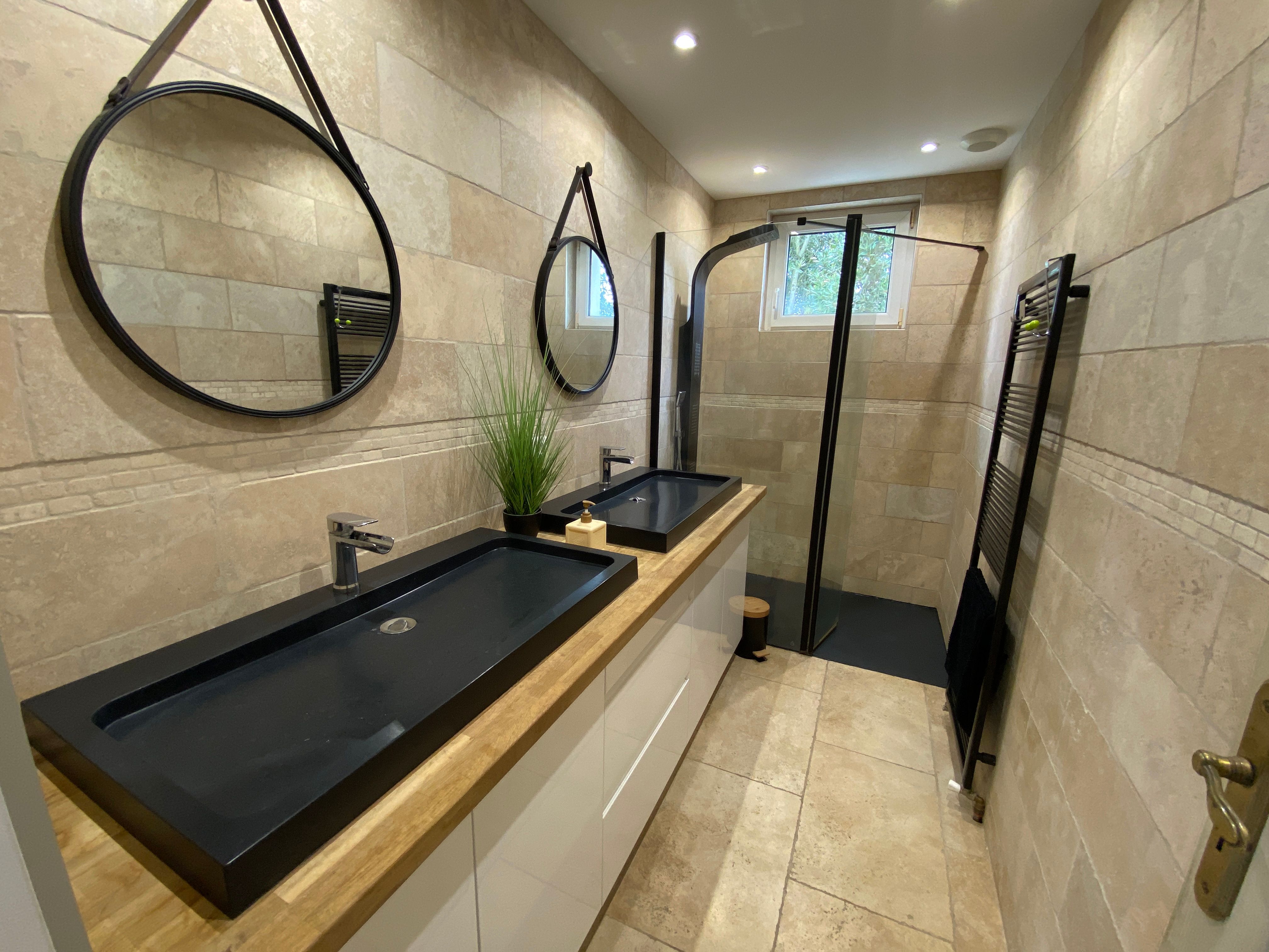 The accommodation comprises two interconnected areas, on the ground and ground floors, with all modern comforts. On the ground floor, there is a living room with a fitted kitchen (fridge-freezer, hob, oven, washing machine), table and chairs, corner sofa and TV. A bedroom (2 x 0.90cm beds), a bedroom (1 x 140cm bed) and a huge shower room with wc. Via an internal staircase and another external staircase, the 1st floor offers a large living room with fireplace (TV insert), corner sofa, dining area (table and chairs), and integrated kitchen area (cooking facilities, dishwasher, oven, microwave, fridge). Two bedrooms (2 single beds), one bedroom (1 double bed), shower room and separate wc. Balcony on first floor. Covered pergola with garden table and stools, string lights. Wifi throughout. Bed linen, towels and household linen provided and included in the price. Wood for the fireplace provided. Charcoal barbecue. Fenced garden with trees and gate. Bicycles can be stored at the rear.