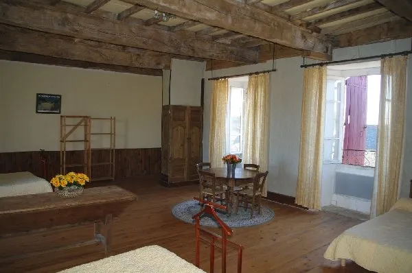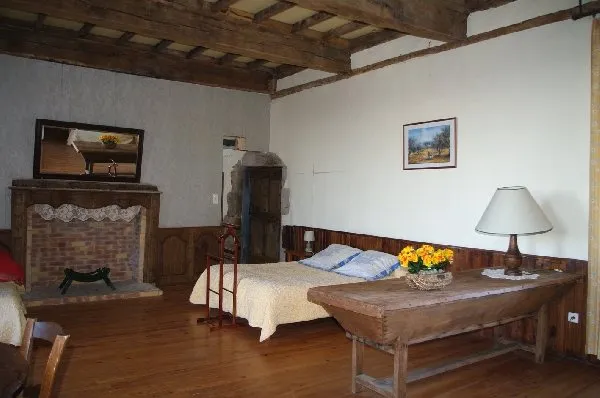 Chambre au 2ème étage du manoir (escalier à vis avec 47 marches !) : une chambre avec deux lits de 140 et deux lits de 90. Salle de bain avec douche, WC.
