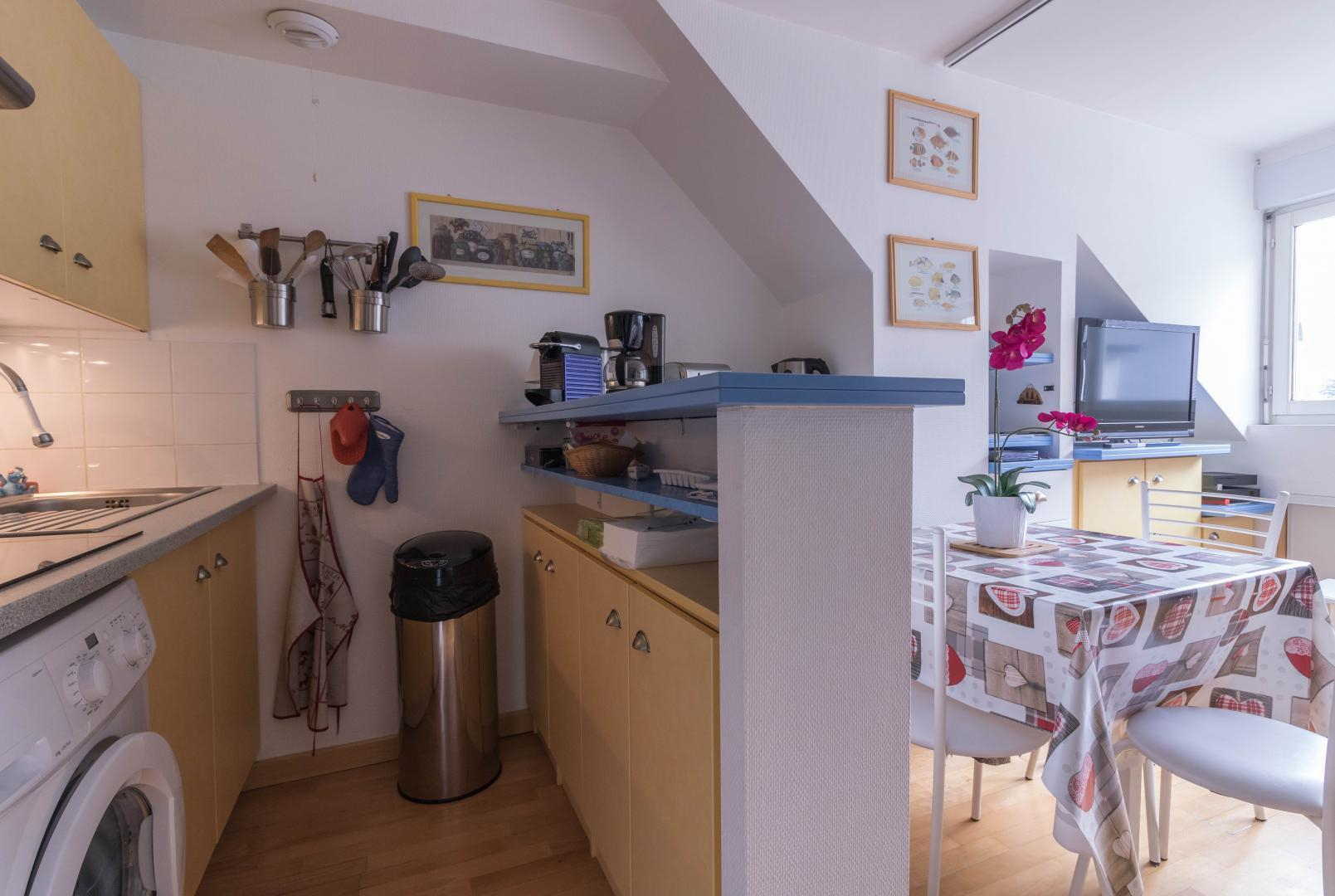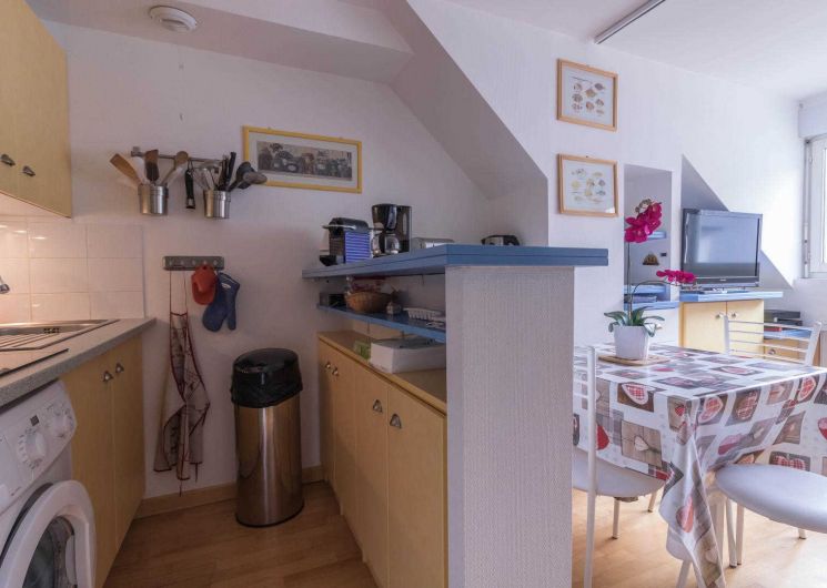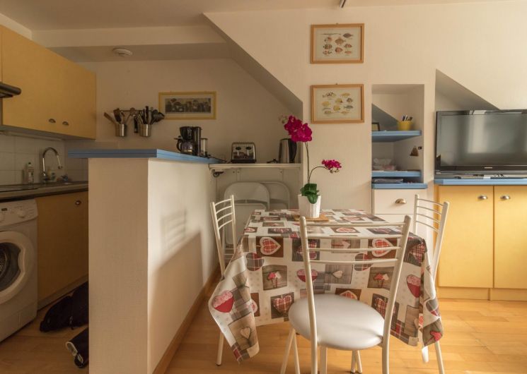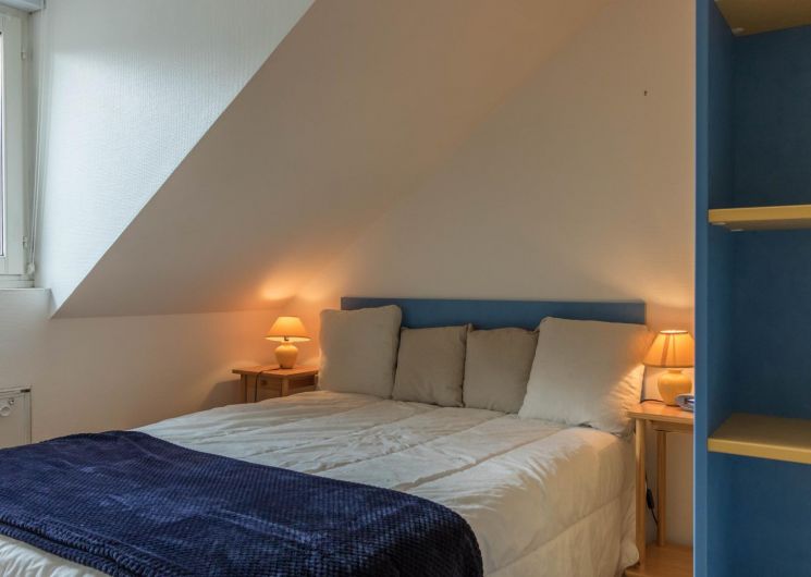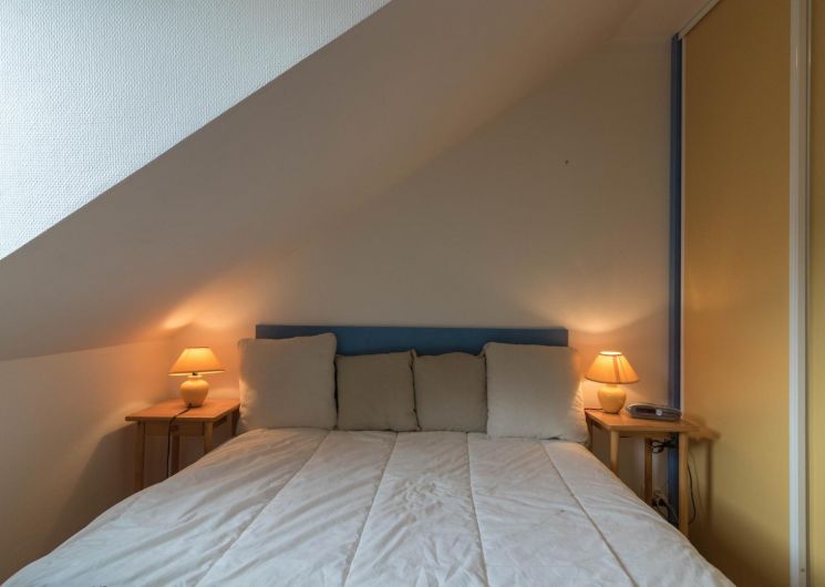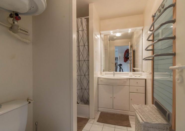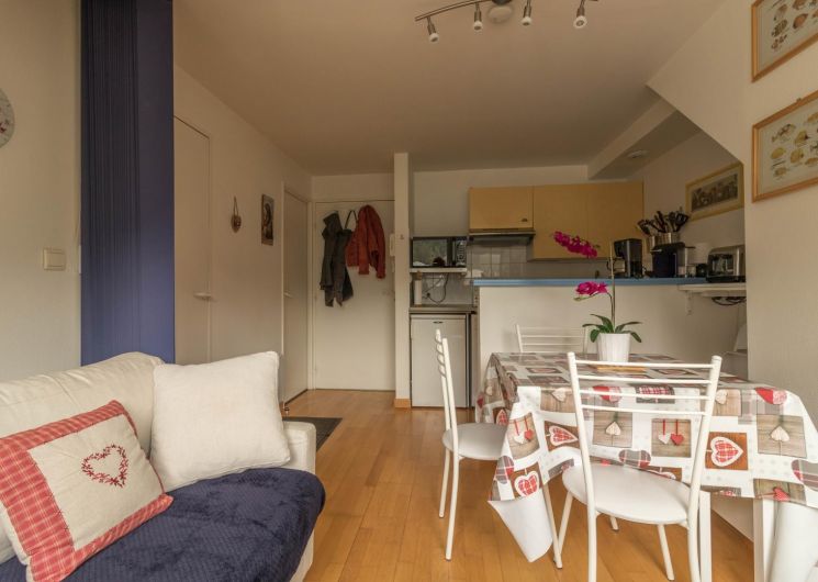 Piso en la 4ª planta de la residencia, accesible por ascensor: entrada directa al salón, pequeña cocina americana, zona de descanso con sofá cama. Habitación independiente con techos inclinados (1 x cama doble de 140 cm), cuarto de ducha/WC. Calefacción eléctrica, conexión wifi a internet. Hay un trastero en la planta baja para esquís y botas y posiblemente 1 o 2 bicicletas. Sala de esquí. Aparcamiento privado en el patio. Internet