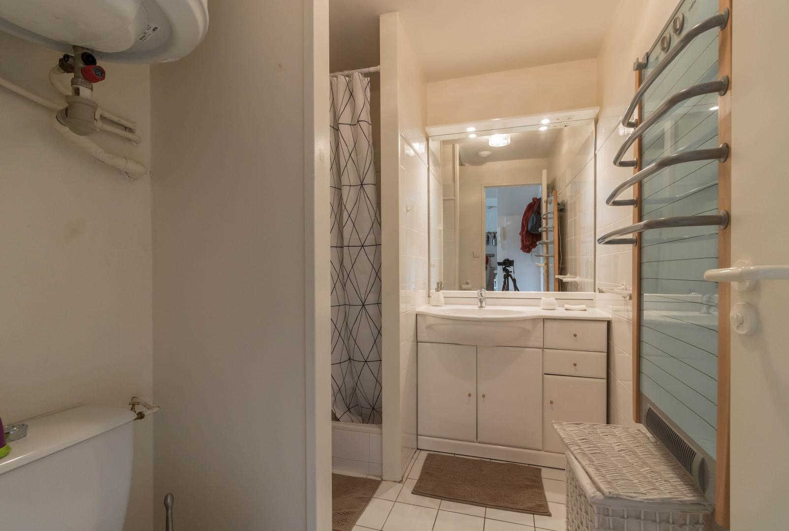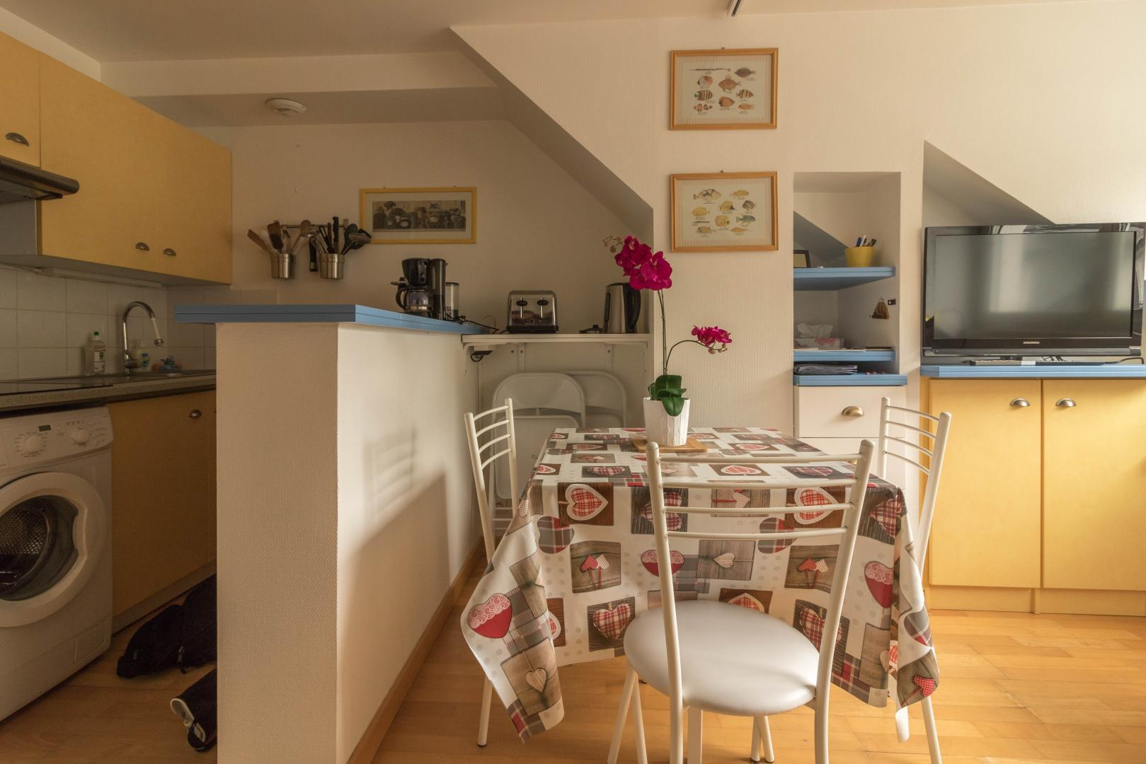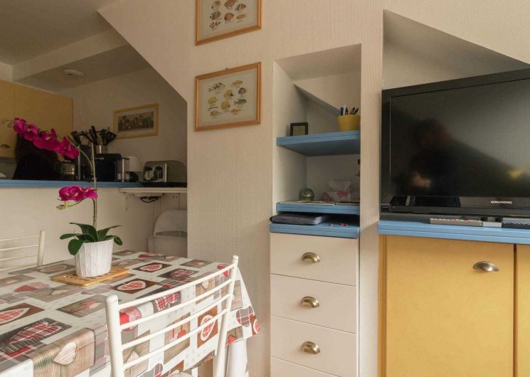 Piso en la 4ª planta de la residencia, accesible por ascensor: entrada directa al salón, pequeña cocina americana, zona de descanso con sofá cama. Habitación independiente con techos inclinados (1 x cama doble de 140 cm), cuarto de ducha/WC. Calefacción eléctrica, conexión wifi a internet. Hay un trastero en la planta baja para esquís y botas y posiblemente 1 o 2 bicicletas. Sala de esquí. Aparcamiento privado en el patio. Internet