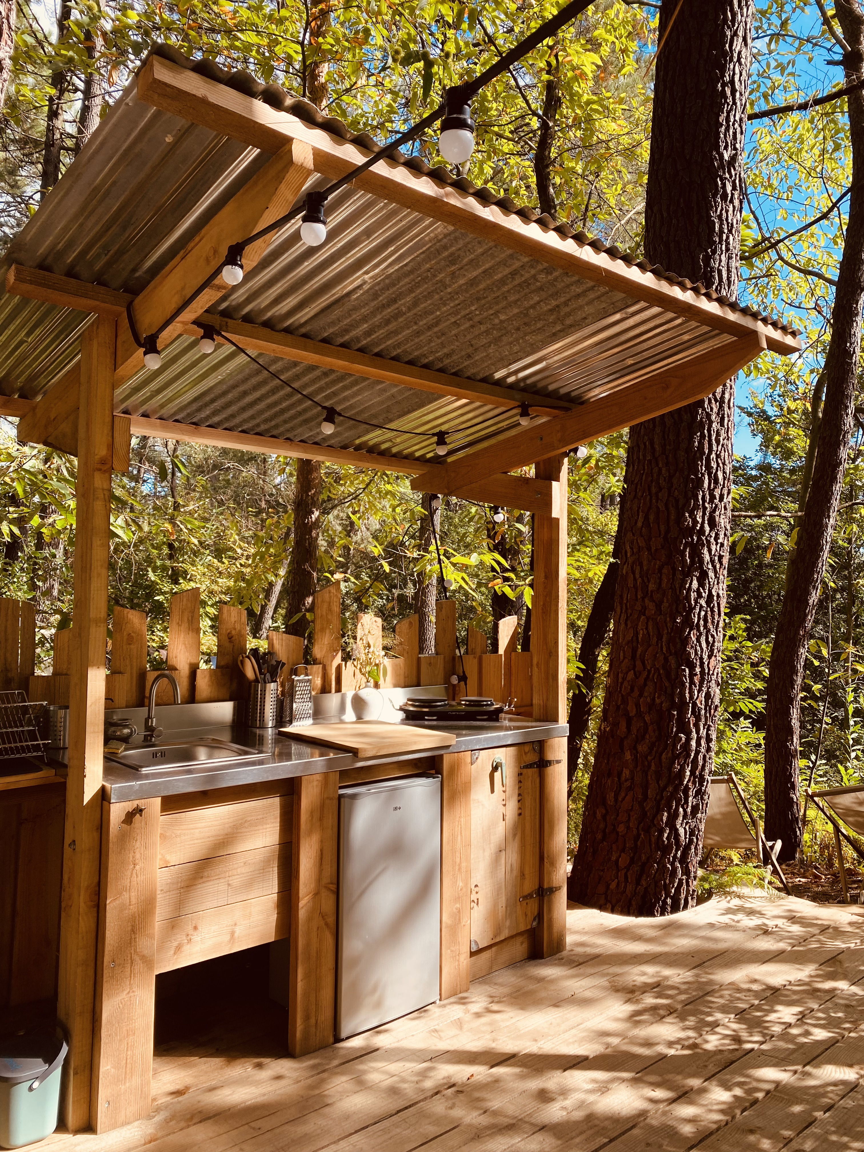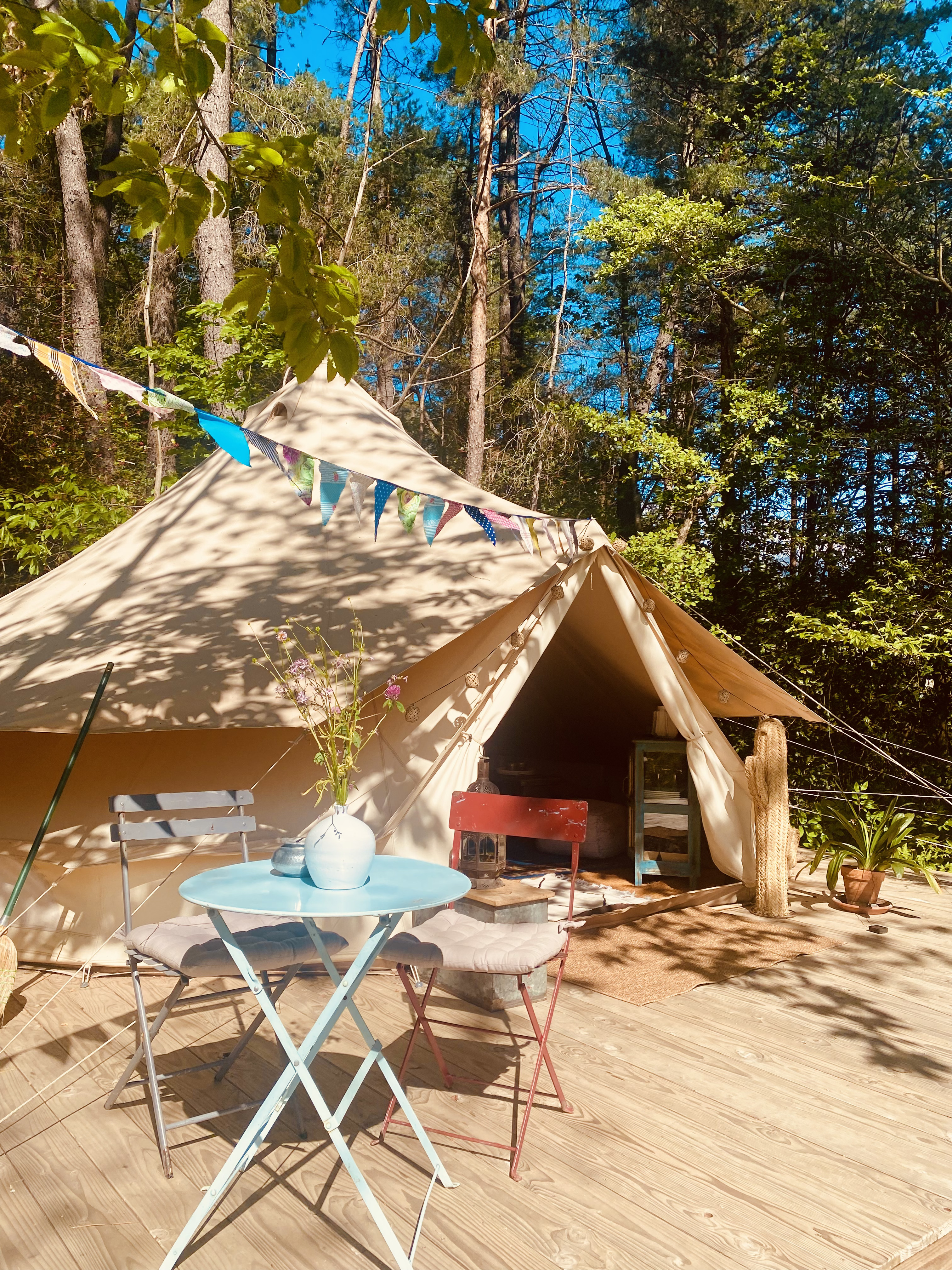 Séjournez dans la tente Zina, un hébergement au charme oriental soigneusement aménagé pour une escapade dépaysante et ressourçante. Vous allez adorer ce cocon de confort et d’authenticité. Avec ses 28 m² baignés de lumière, cette tente spacieuse allie simplicité et élégance. Son ambiance épurée et raffinée, invite à la détente et à l’évasion. À quelques pas de votre tente, une cuisine en bois de 20 m² surélevée parmi les arbres vous attend.