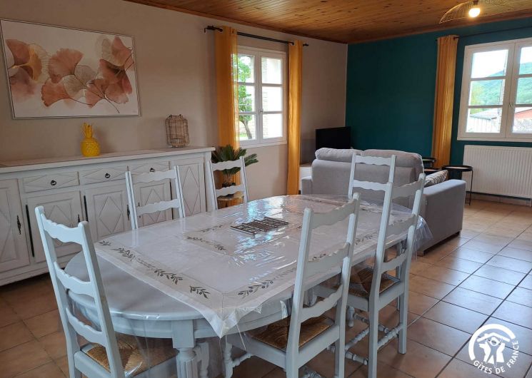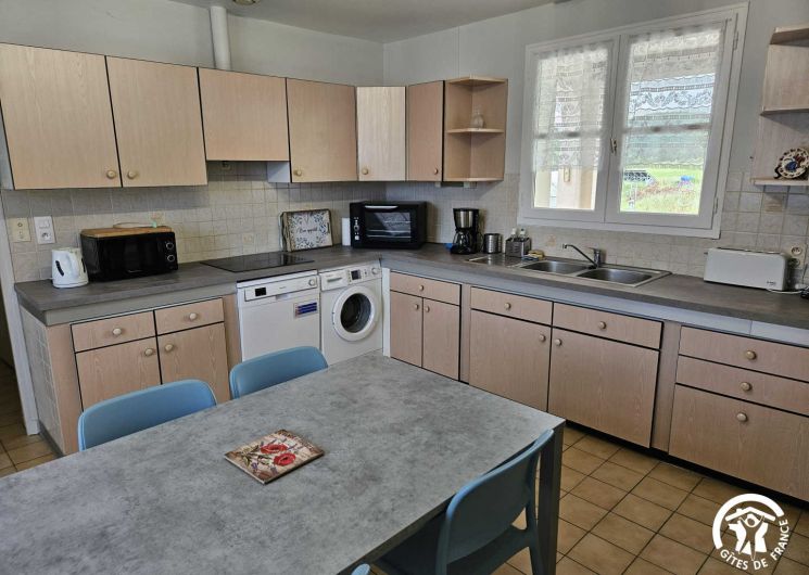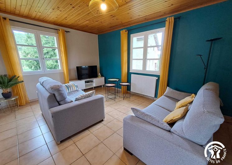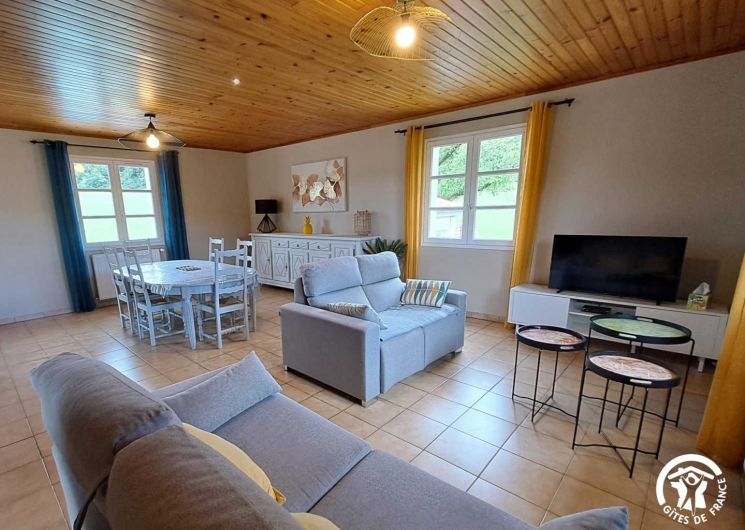 Le gîte, totalement indépendant et situé à l’étage, accueille confortablement six personnes, avec la possibilité d’un couchage supplémentaire grâce au canapé convertible du salon. L’espace de vie se compose d’un séjour lumineux de 35 m² doté de deux canapés et d’un téléviseur grand écran, d’une grande salle à manger et d’une cuisine indépendante de 16 m² équipée d’un second téléviseur, d’un petit four, plaque induction, lave-vaisselle, micro-ondes, lave-linge, cafetière… Un cellier complète l’ensemble.