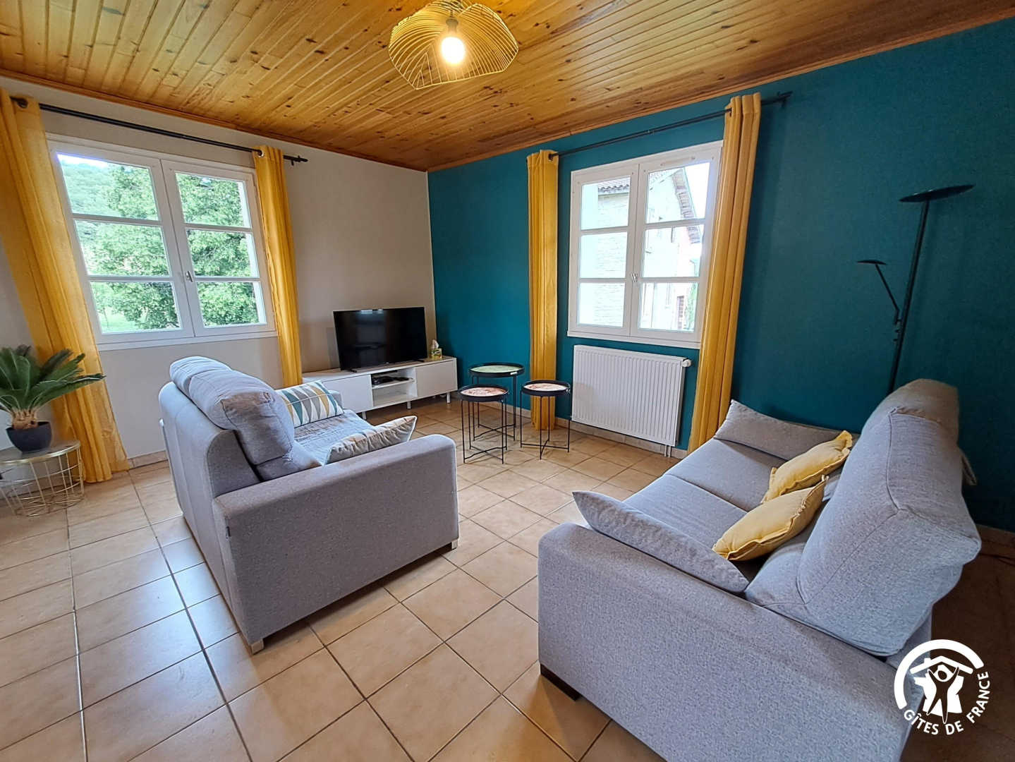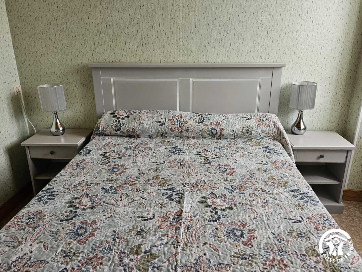Le gîte, totalement indépendant et situé à l’étage, accueille confortablement six personnes, avec la possibilité d’un couchage supplémentaire grâce au canapé convertible du salon. L’espace de vie se compose d’un séjour lumineux de 35 m² doté de deux canapés et d’un téléviseur grand écran, d’une grande salle à manger et d’une cuisine indépendante de 16 m² équipée d’un second téléviseur, d’un petit four, plaque induction, lave-vaisselle, micro-ondes, lave-linge, cafetière… Un cellier complète l’ensemble.