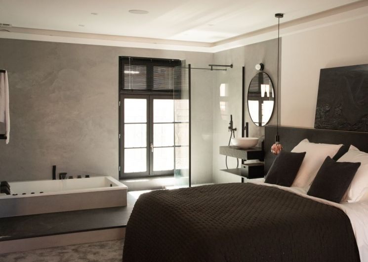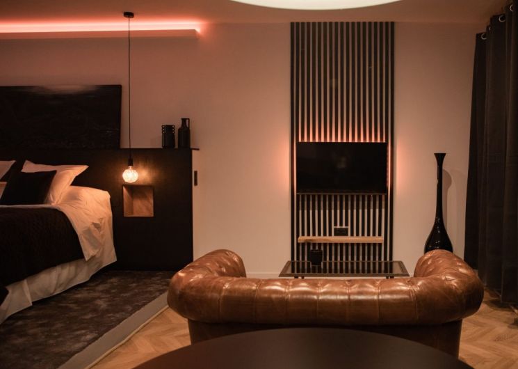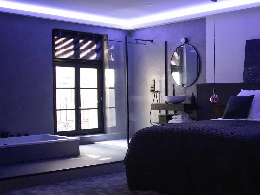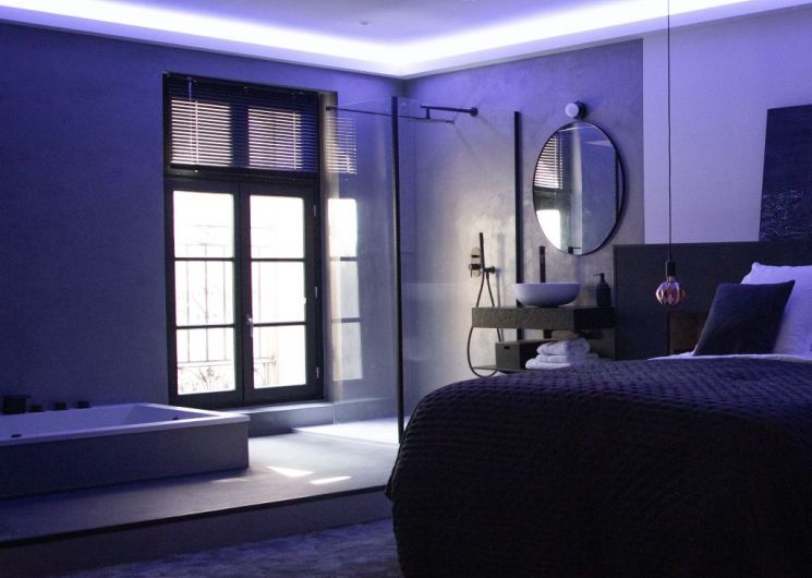 En el espíritu de un loft industrial, la suite Onyx, ideal para escapadas románticas, le encantará con su terraza en la azotea que ofrece vistas panorámicas sobre la ciudad y el Castillet, permitiéndole tomar el sol en su sauna exterior fuera de la vista. En el interior, el jacuzzi, la botella de champán de cortesía a la llegada, la combinación de materiales nobles y una decoración decididamente moderna le invitan a disfrutar de un ambiente refinado e íntimo.