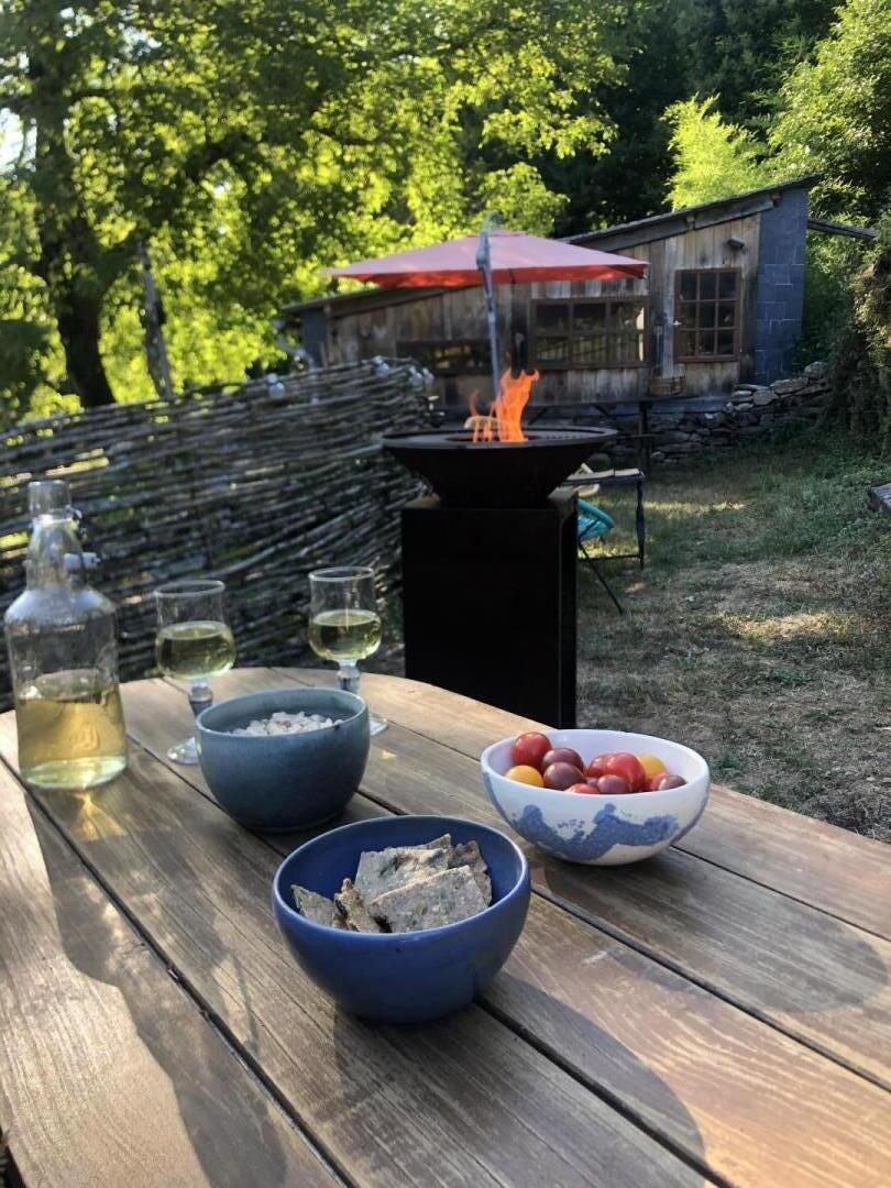 Les extérieurs sont à l’image du lieu, simples et naturels. Une terrasse avec brasero permet de prendre les repas au grand air, tandis que plusieurs espaces disséminés sur la propriété invitent à se poser. En contrebas du gîte, une source alimente un ruisseau où il fait bon tremper les pieds. Vous croiserez chèvres, ânes et chien, tous les résidents paisibles du domaine.